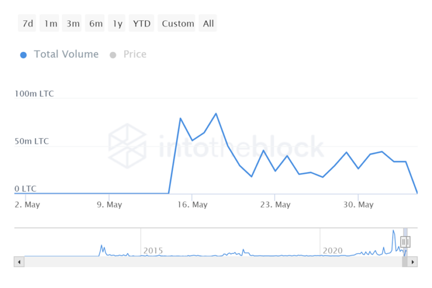 Nhìn chung, điều này tương đương với mức giảm 26% giữa giá mở cửa và đóng cửa của LTC trong tháng Năm.