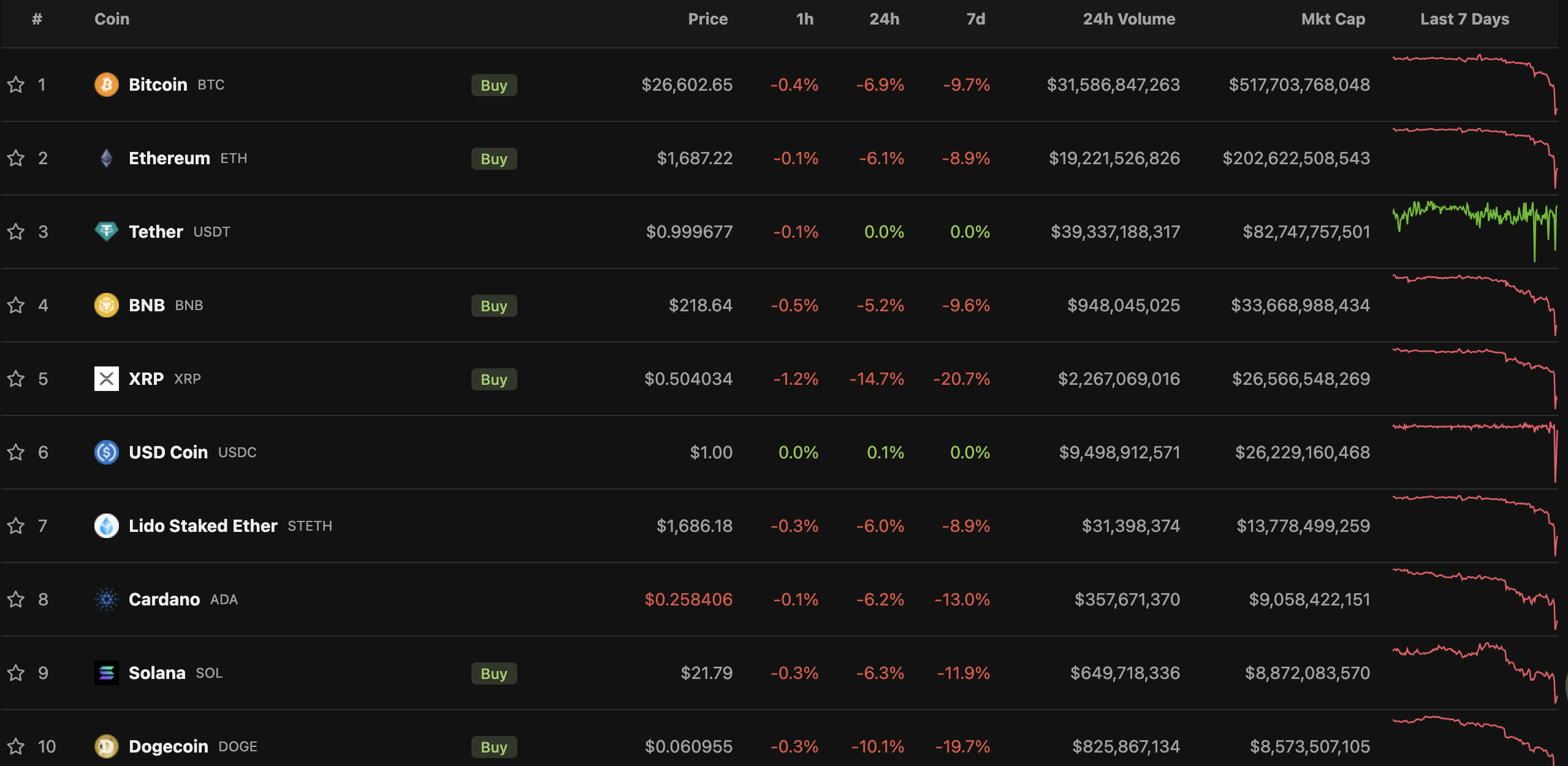 Tại thời điểm BeInCrypto thực hiện bài viết này, vốn hoá toàn thị trường tiền điện tử được ghi nhận ở mức 1,11 nghìn tỷ USD. Top 10 đồng coin hàng đầu đều chứng kiến mức giảm từ 5% – 15%. Trong đó, đáng chú ý nhất là XRP ghi nhận mức giảm đến 14,7% sau chuỗi ngày tăng nóng. Sự sụt có phần nặng ký này của XRP được cho là hệ quả của việc Thẩm phẩn Torress đã cho phép SEC nộp đơn kháng cáo trong vụ kiện mà Ripple đã giành được một chiến thắng nhỏ trước SEC hồi tháng trước.