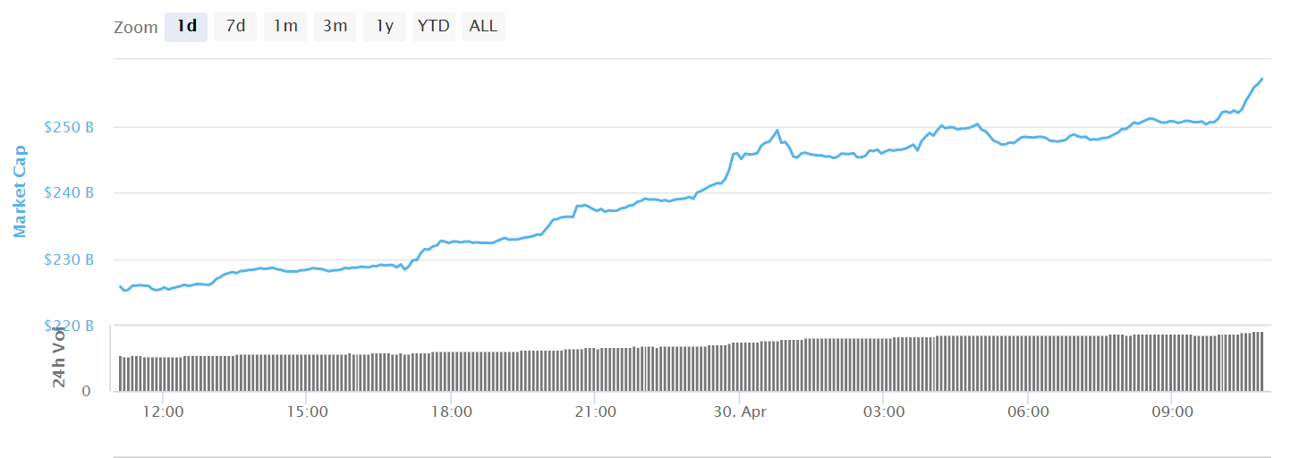 Bitcoin và phần còn lại của thị trường tiền điện tử hôm nay (30/4) ngập tràn sắc xanh. Chỉ trong 24 giờ qua, tổng vốn hóa của toàn thị trường tiền điện tử đã có thêm 32 tỷ USD.