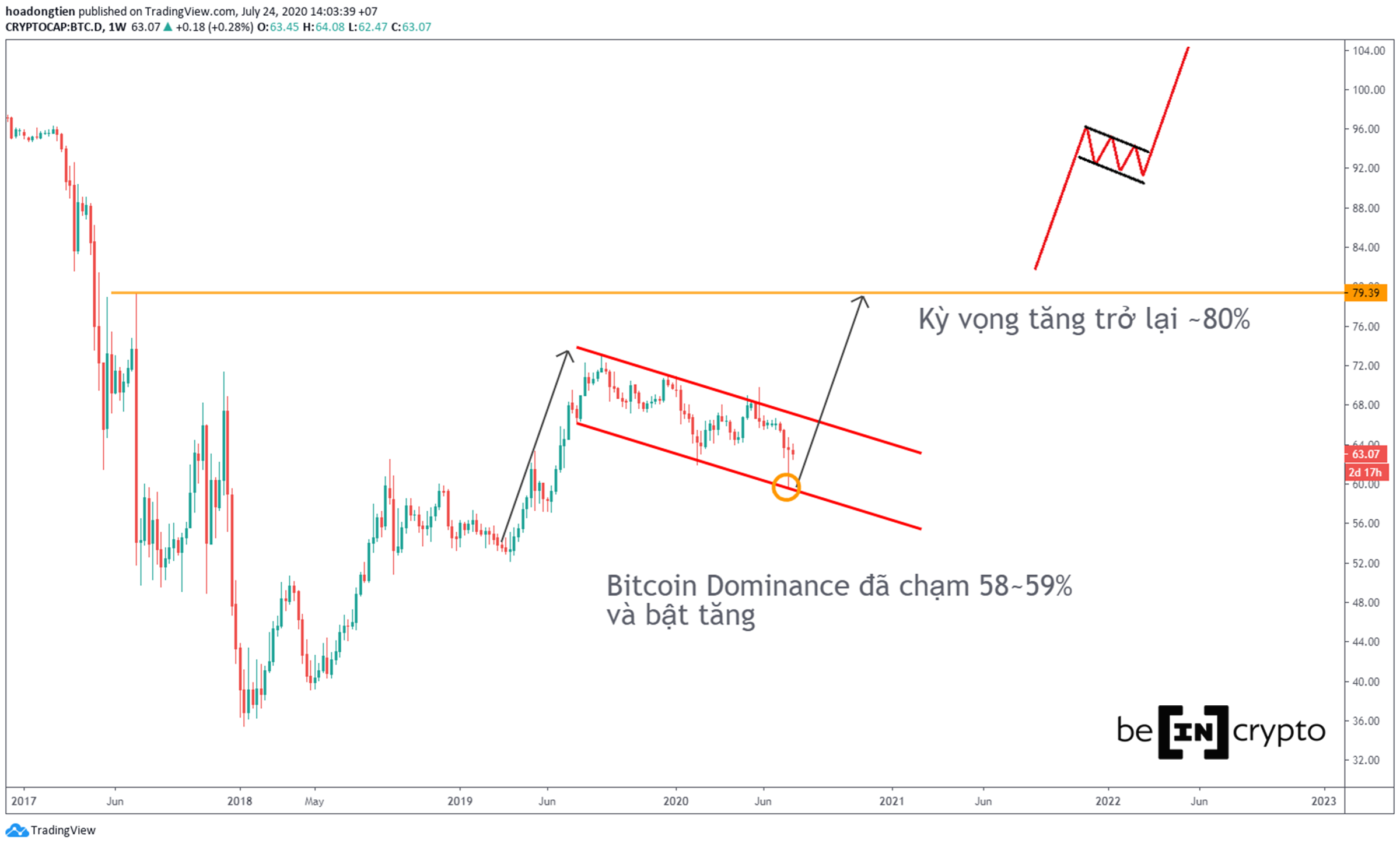 Điều quan trọng nhất khi lướt sóng mùa Altcoin Season là quan sát Bitcoin Dominance (tức tỷ trọng hay thị phần của Bitcoin trong thị trường). Ở bài viết trước, chúng tôi từng đưa ra lựa chọn về việc Bitcoin Dominance sẽ về vùng 58% và bật lên. Điều này đã được thể hiện cho đến hiện tại bằng một râu nến dài trong biểu đồ nến của Bitcoin Dominance.
