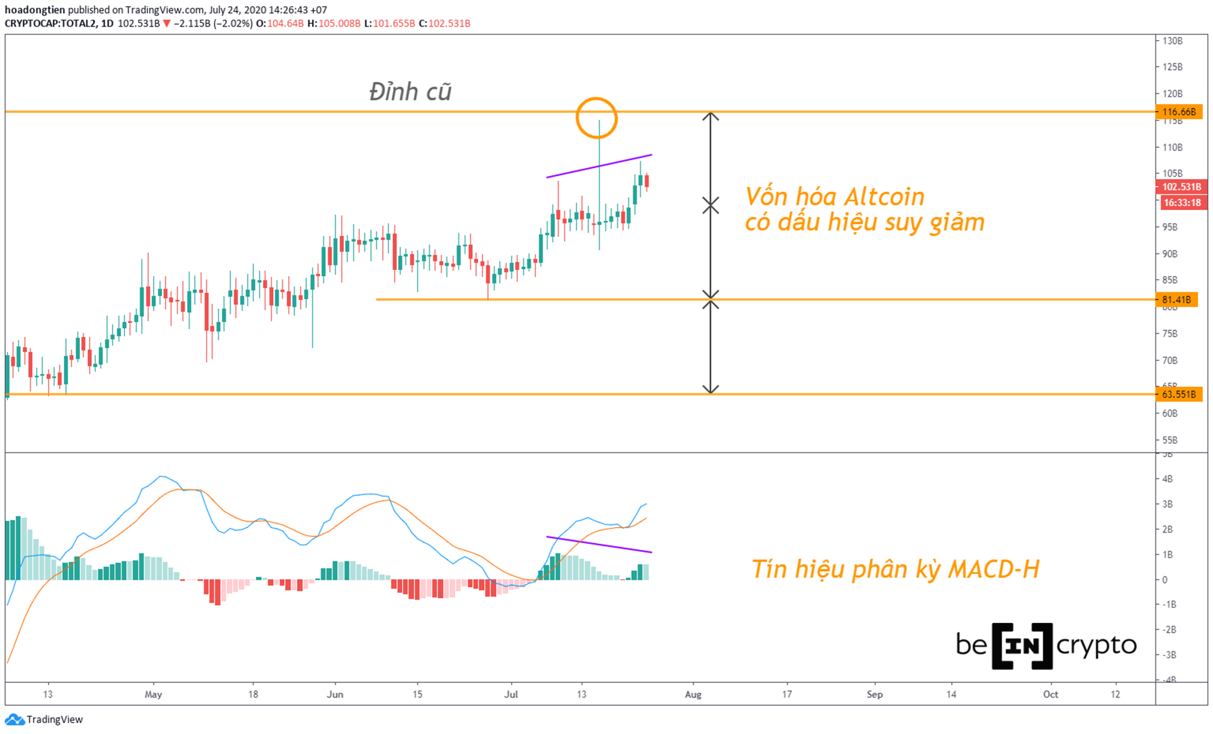 Vẫn còn quá sớm để xác minh liệu khả năng Bitcoin Dominance có đi đúng kỳ vọng như trên hay không? Nhưng trước mắt, vùng 58~59% đã cho thấy đây là vùng hỗ trợ tốt. Bên cạnh đó vốn hóa của thị trường lại một lần nữa tiến vào cùng kháng cự.