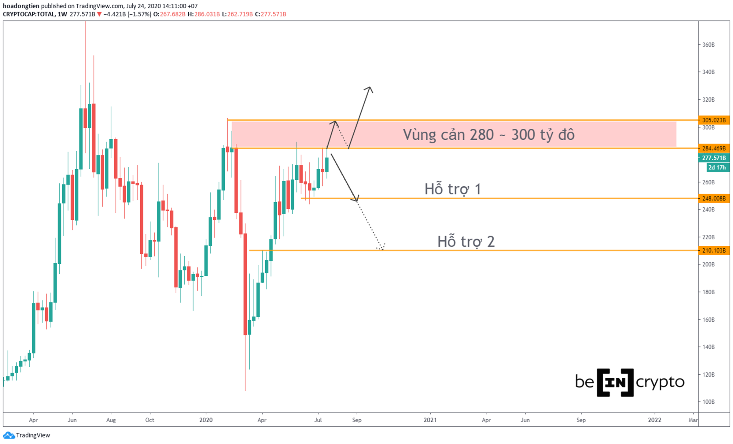 - Vùng cản 280~300 tỷ đô là một vùng kháng cự mạnh, nếu muốn kỳ vọng giá Bitcoin lên cao hơn, thì ít nhất vốn hóa cũng cần vượt qua 280% tỷ đô và giao dịch ổn định trên mức này.