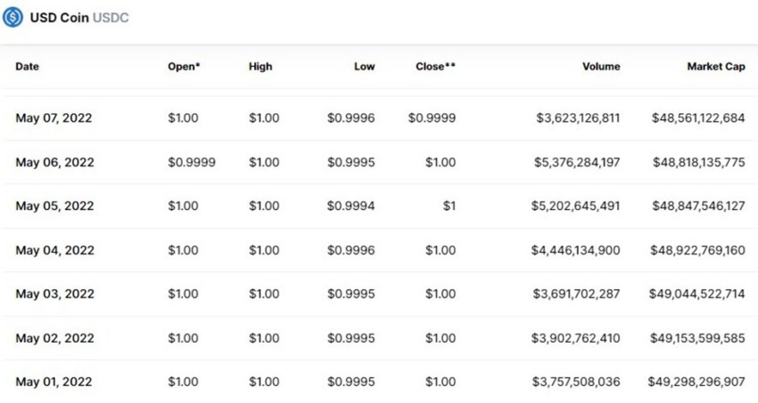 Điều này đánh dấu mức tăng 8% so với giá trị thị trường của nó tại ngày mở cửa. Theo đó, vào ngày 1 tháng 5, USDC có khối lượng giao dịch là 3.76 tỷ USD, tương ứng với giá trị vốn hóa thị trường khoảng 49.29 tỷ USD.