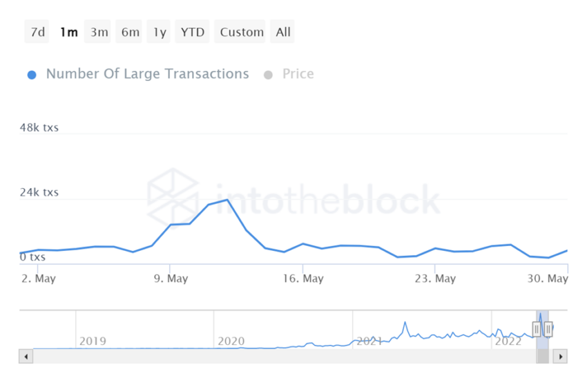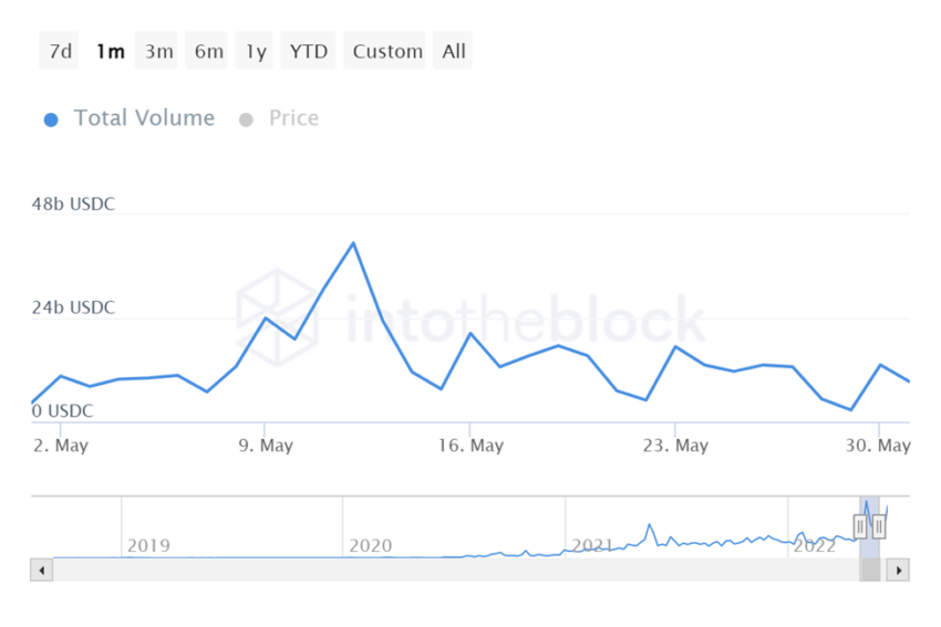 Vào tháng 5, số lượng giao dịch lớn đạt đỉnh trong tuần từ ngày 9 đến ngày 15 tháng 5. Trong tuần, USDC đã tham gia vào 97,140 giao dịch. Như đã nói, số lượng giao dịch lớn đã đạt mức cao nhất là 23,690 ở mức giá 0.966500 USD vào ngày 12 tháng 5.