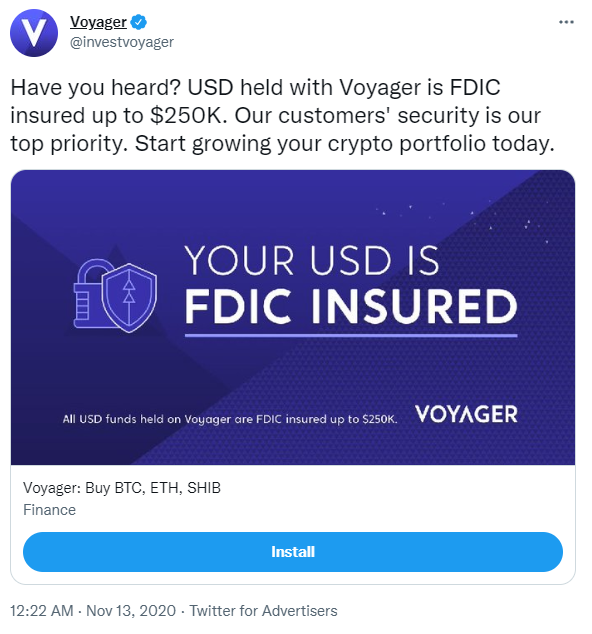 SponsoredThời điểm trước đó, Voyager xem đây như là một lợi thế cạnh tranh để kêu gọi tiền từ các nhà đầu tư vào mình, trong đó bao gồm cả tiền điện tử. Tuy nhiên, ít ai ngờ rằng 2 năm sau khi những lời mời kêu gọi đầu tư này của Voyager, nhiều nhà đầu tư đã gửi tiền điện tử vào công ty này có thể sẽ không nhận được khoản bảo hiểm từ FDIC như nhiều người vẫn lầm tưởng.