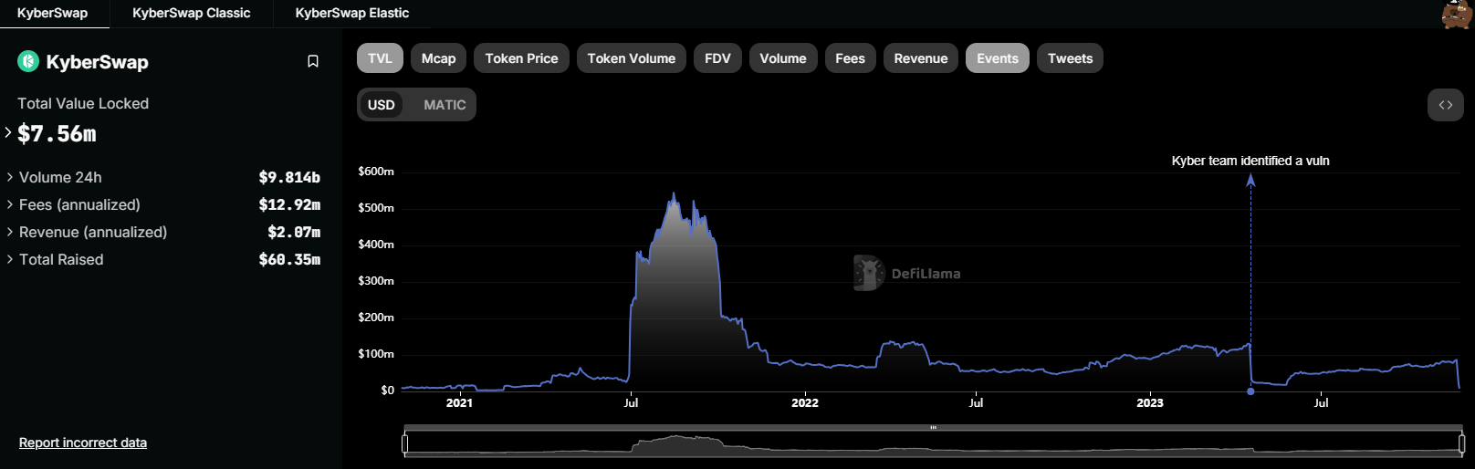 Ngoài việc bị đánh cắp số tiền lớn, dữ liệu của DefiLlama cho thấy TVL của KyberSwap cũng giảm 68% trong vài giờ và gần 78 triệu USD đã rời khỏi giao thức do vụ hack và người dùng rút tiền. Tại thời điểm chúng tôi viết bài này, TVL của nó hiện ở mức 7.56 triệu USD, giảm mạnh so với mức cao nhất năm 2023 là 134 triệu USD.