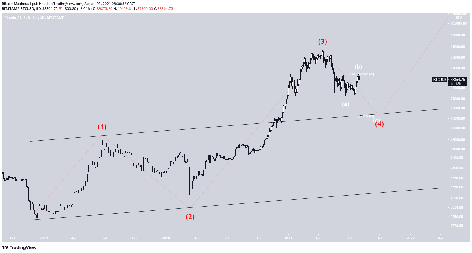 Số lượng sóng chỉ ra rằng BTC có khả năng đã hoàn thành sóng B của cấu trúc điều chỉnh A-B-C (màu trắng). Theo đó, toàn bộ sóng được đo kể từ mức cao nhất mọi thời đại mà BTC đã lập được hồi tháng 4.