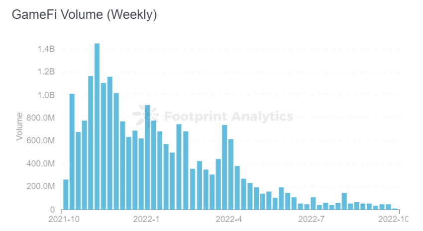 Trong vài tháng qua do một số vụ vi phạm dữ liệu và các cuộc tấn công xảy ra với các giao thức hàng đầu, cùng với số lượng người dùng giảm lớn nên lĩnh vực GameFi đã bị ảnh hưởng đáng kể. Trong suốt năm nay, khối lượng giao dịch GameFi hàng tuần đã trượt giảm từ mức cao 1.4 tỷ USD vào tháng 11 xuống còn 45 triệu USD vào tuần trước.