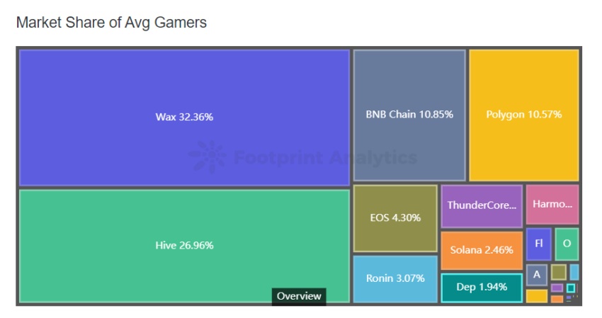 Hơn nữa, WAX cũng dẫn đầu về lượng game thủ trung bình, với hơn 32% tổng thị phần. HIVE chiếm vị trí thứ 2 về số người chơi trung bình với 26.96%, tiếp theo là BNB Chain với 10.85%.