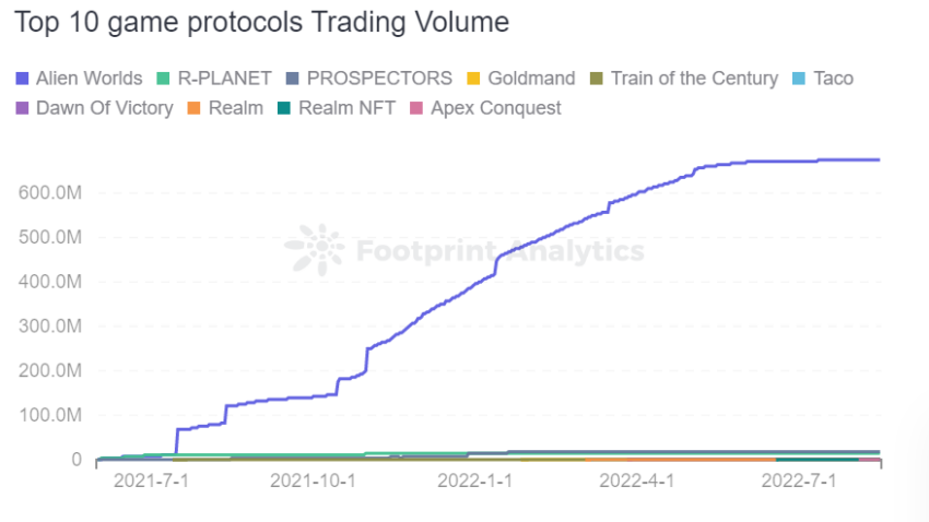Khi xem xét khối lượng giao dịch của 10 giao thức trò chơi hàng đầu trên WAX, Alien Worlds dẫn đầu với khối lượng hàng ngày hơn 670 triệu trong khi các trò chơi khác như R-Planet và Taco có khối lượng thấp hơn đáng kể.