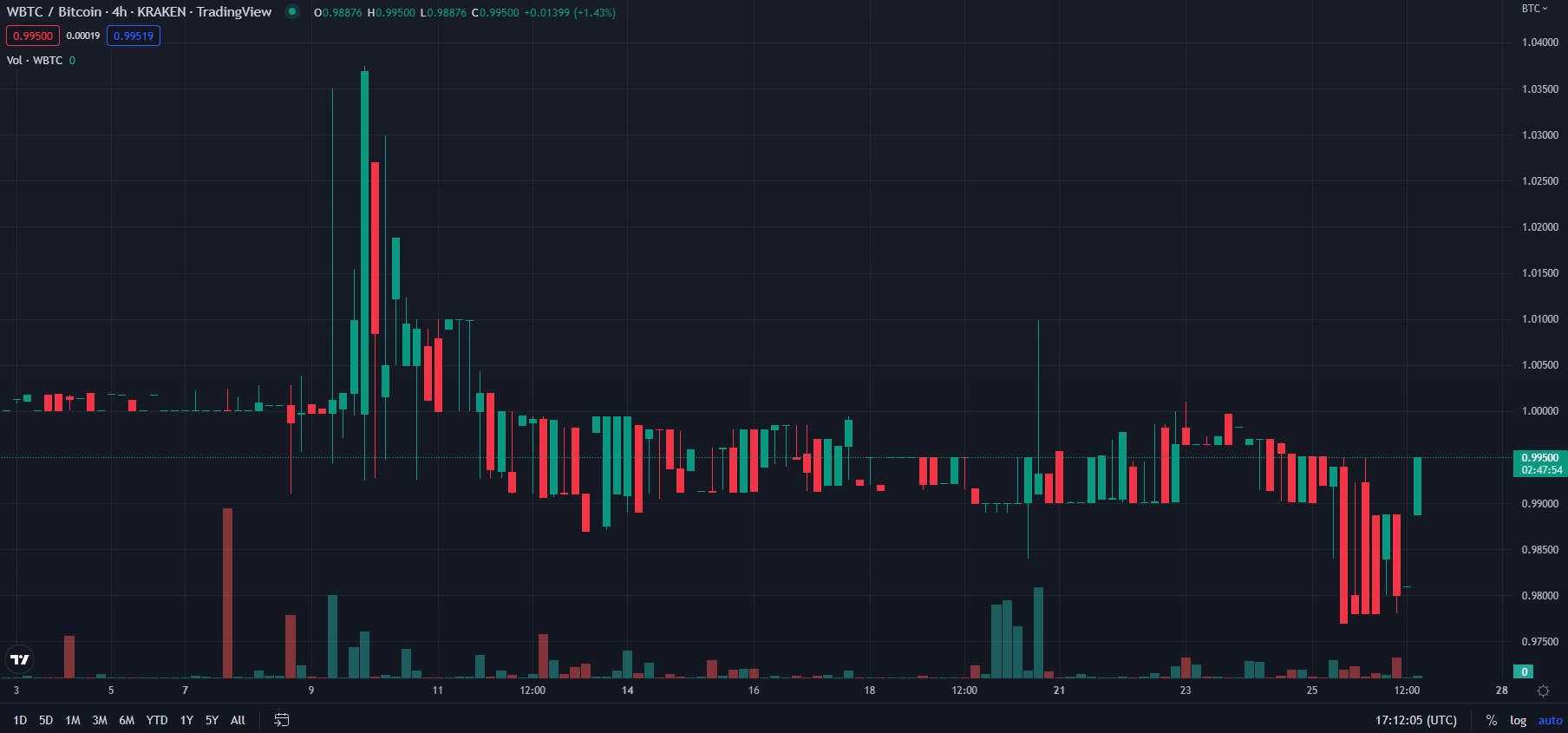 SponsoredTại thời điểm BeInCrypto thực hiện bài viết này (00:26 ngày 27/11/2022 giờ UTC +7), tỷ giá WBTC/BTC hiện ở mức 0.9950. Tuy nhiên, mức thấp nhất được ghi nhận khi WBTC bị depeg và giảm xuống mức 0.97702 vào thời điểm 12:00 ngày 25/11. Vậy thực tế chuyện gì đang xảy ra với WBTC? Liệu rằng WBTC có khả năng sẽ “sập” trong thời gian tới?