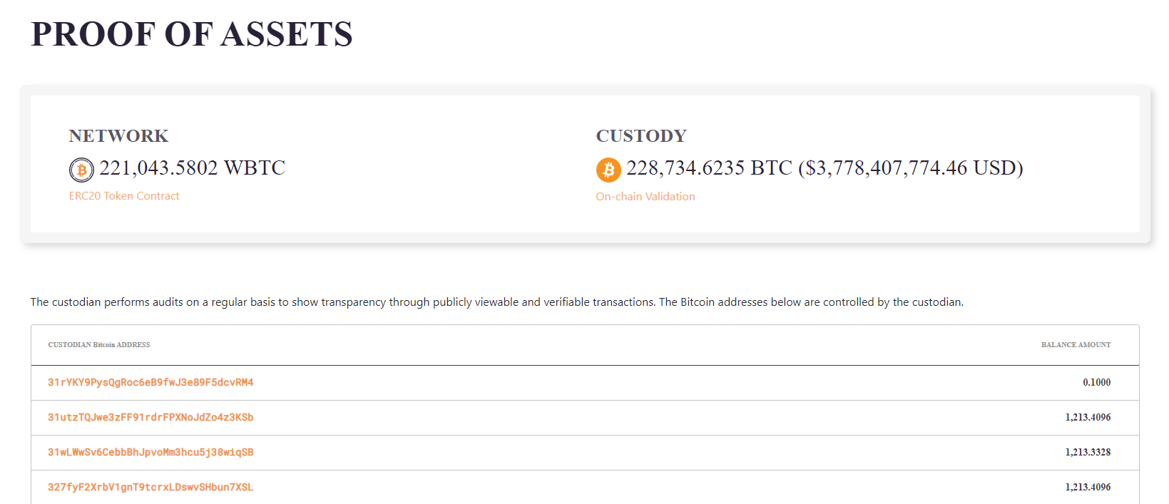 Cụ thể, lượng BTC được nắm giữ bởi các custodian hiện đang lớn hơn nhiều so với lượng WBTC đang lưu hành. Theo dữ liệu từ chính trang web của WBTC về bằng chứng dự trữ thì cung cấp thì tỷ lệ giữa BTC và WBTC đang là 228,734 BTC và 221,043 WBTC.