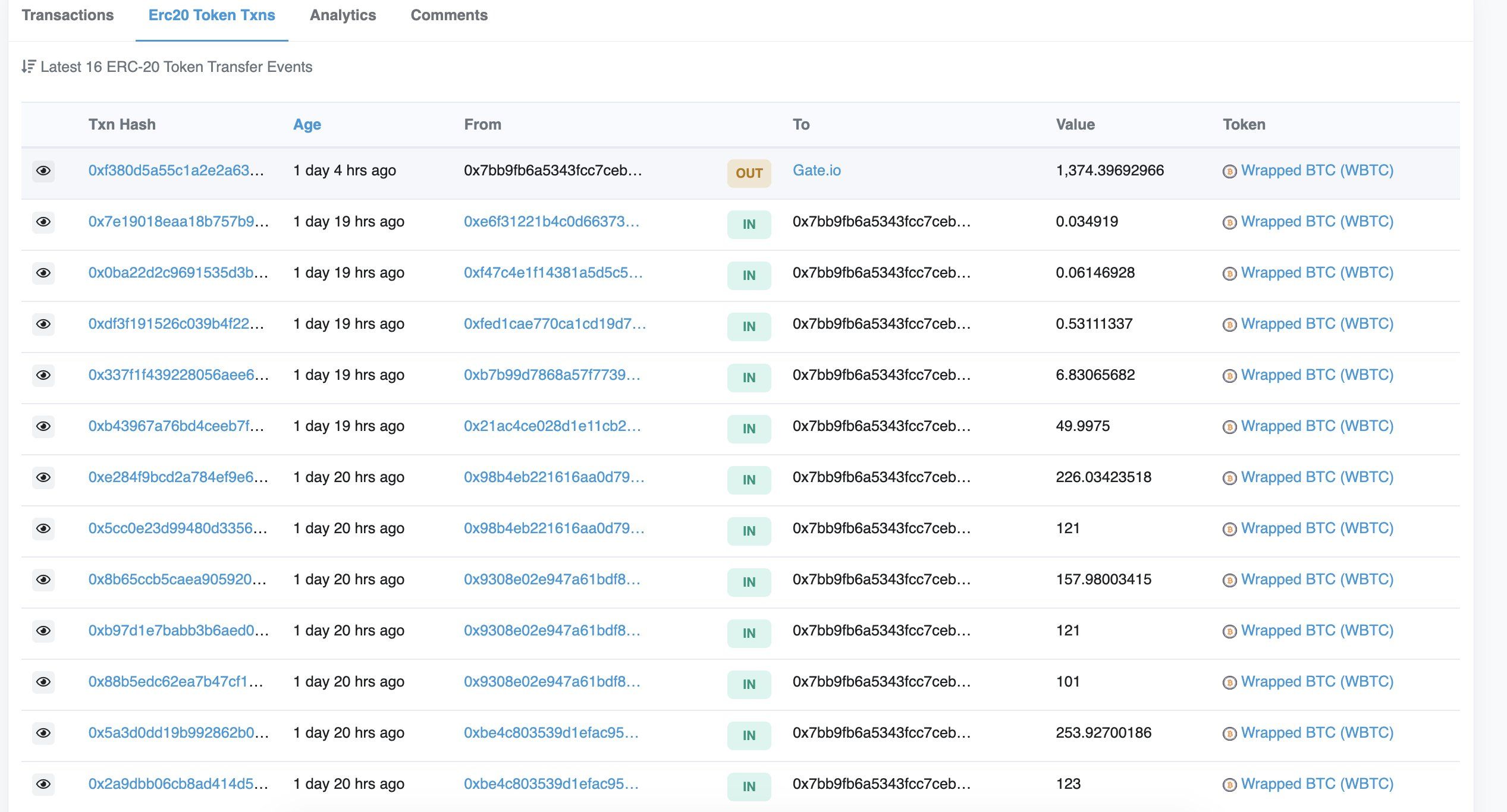 SponsoredĐối mặt với sự cố WBTC bị depeg này, một con cá voi đã hoảng sợ và bán WBTC của mình. Theo đó, địa chỉ của cá voi “0x7bb9” đã gom WBTC từ nhiều ví khác nhau mà nó sở hữu và chuyển tất cả (khoảng 1,374 WBTC) lên sàn giao dịch Gate.io. Nhiều khả năng đây là một động thái bán đến từ cá voi này.