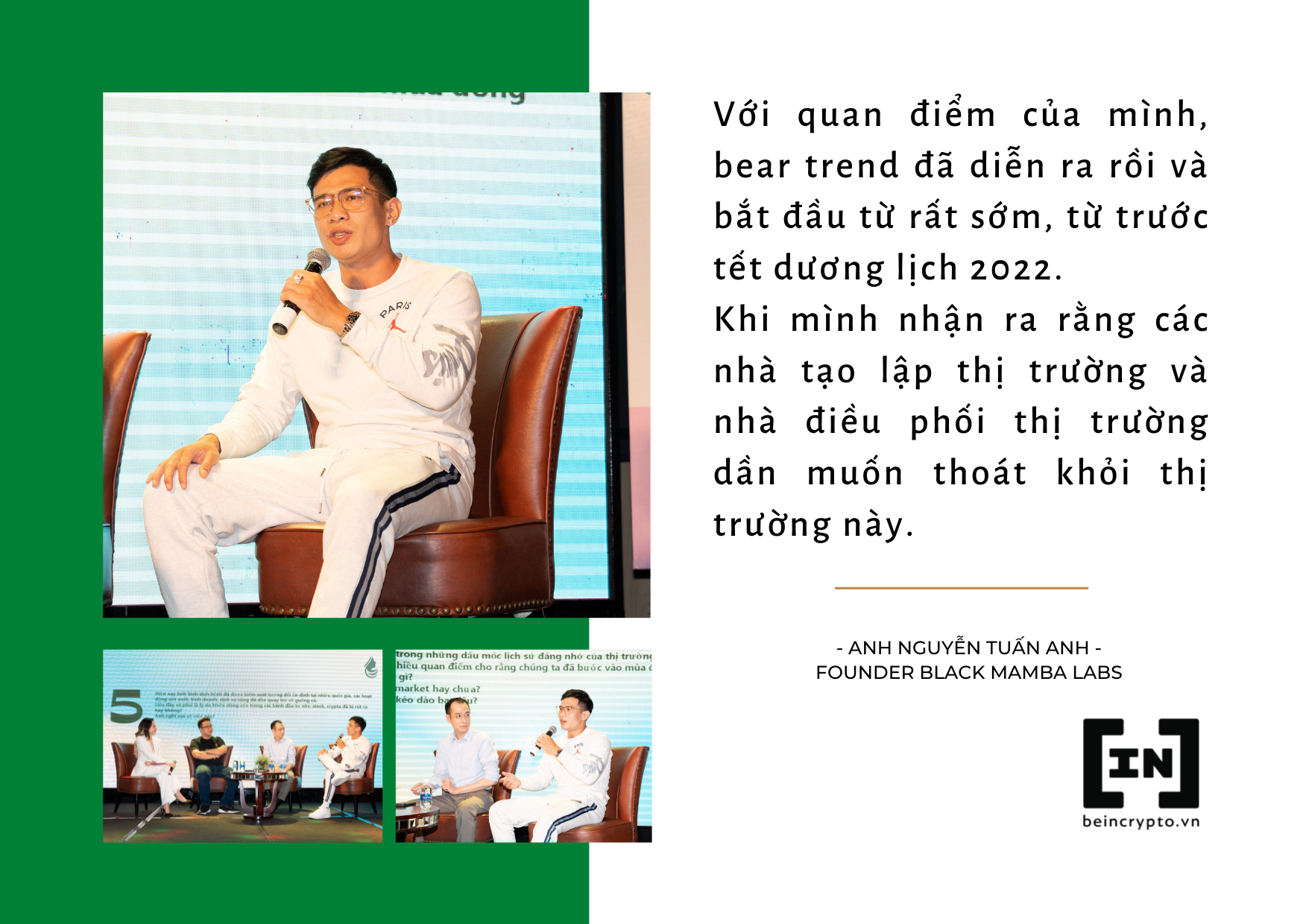 “Với quan điểm của mình, bear trend đã diễn ra rồi và bắt đầu từ rất sớm, từ trước tết dương lịch 2022. Khi mình nhận ra rằng các nhà tạo lập thị trường và nhà điều phối thị trường dần muốn thoát khỏi thị trường này. Đó là khi họ cảm giác đã thỏa mãn. Họ đã trải qua một thời kỳ tích lũy vị thế và muốn bảo toàn vị thế của họ.”