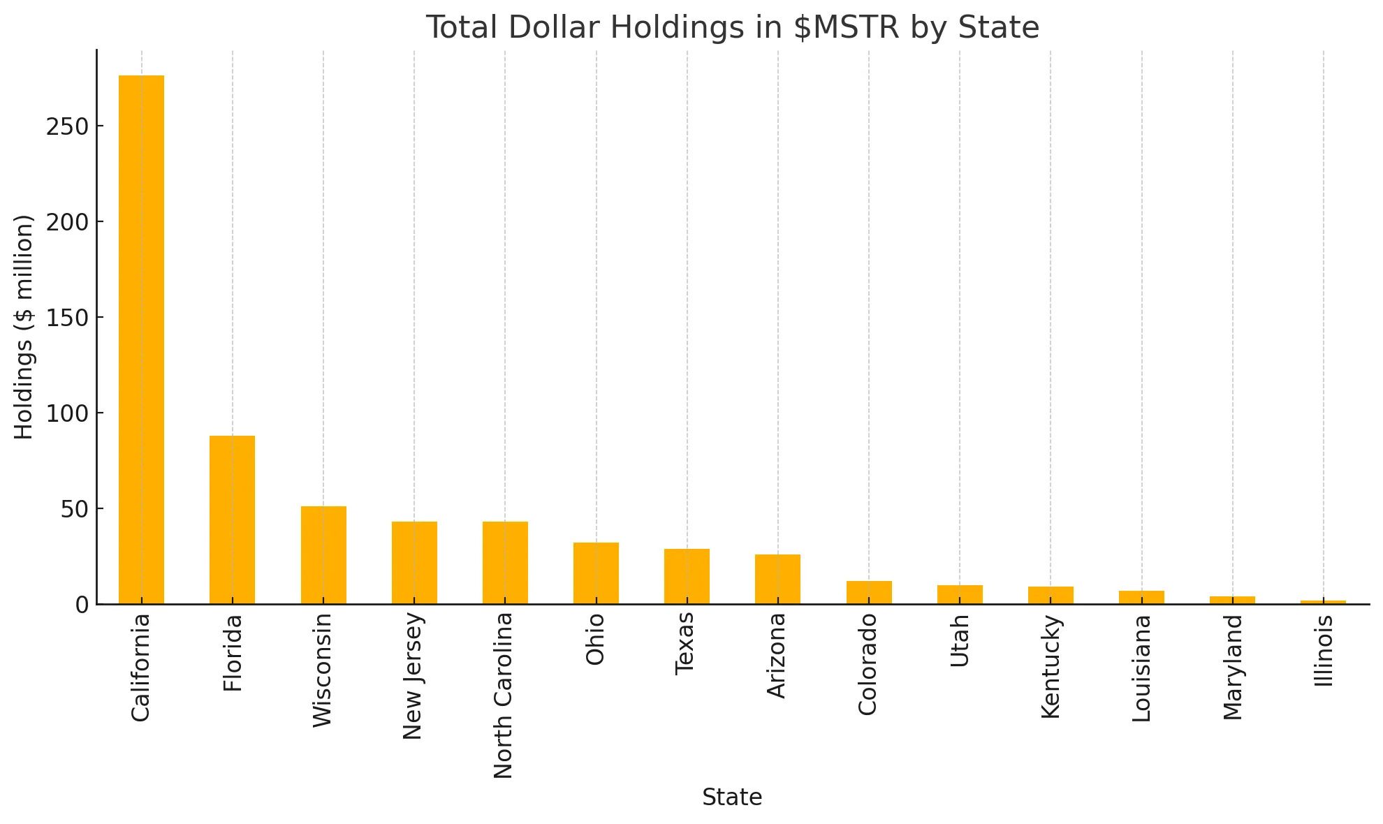 California, thông qua quỹ hưu trí giáo viên và công chức của bang, dẫn đầu với 276 triệu USD cổ phiếu MSTR, tiếp theo là Florida, North Carolina và New Jersey. Mặc dù gần đây có một quyết định phủ quyết dự luật dự trữ Bitcoin, Arizona cũng đã tăng cổ phiếu MSTR của mình.