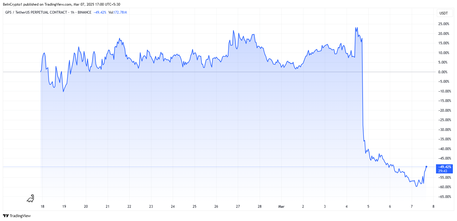 Ngay sau thông báo này, GPS đã giảm giá ngay lập tức 49%. Sự giảm mạnh này phản ánh sự nhạy cảm của thị trường đối với các quyết định niêm yết và hủy niêm yết của Binance.