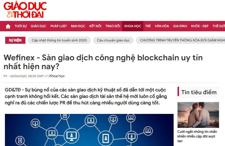SponsoredCó thể thấy, Wefinex xuất hiện trên báo Pháp Luật, báo giáo dục thời đại, và nhiều tờ báo mạng uy tín khác nhưng hiện tại đã bị xóa link.