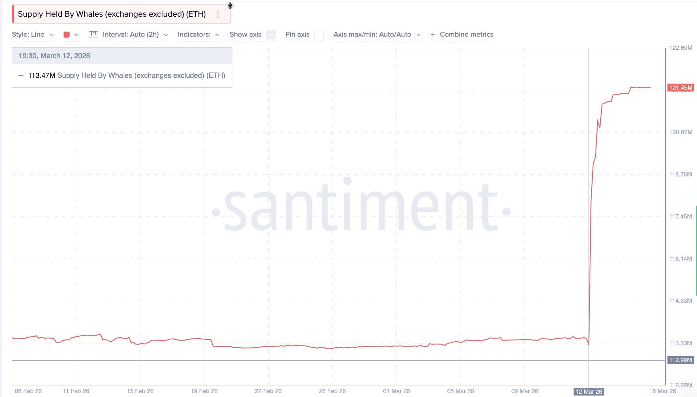 Tính chung, lượng ETH nắm giữ ở các ví cá voi đã tăng từ 113.47 triệu lên 121.45 triệu ETH từ ngày 12/03 đến thời điểm viết bài, tăng thêm khoảng 7.98 triệu ETH, dựa theo dữ liệu từ Santiment.