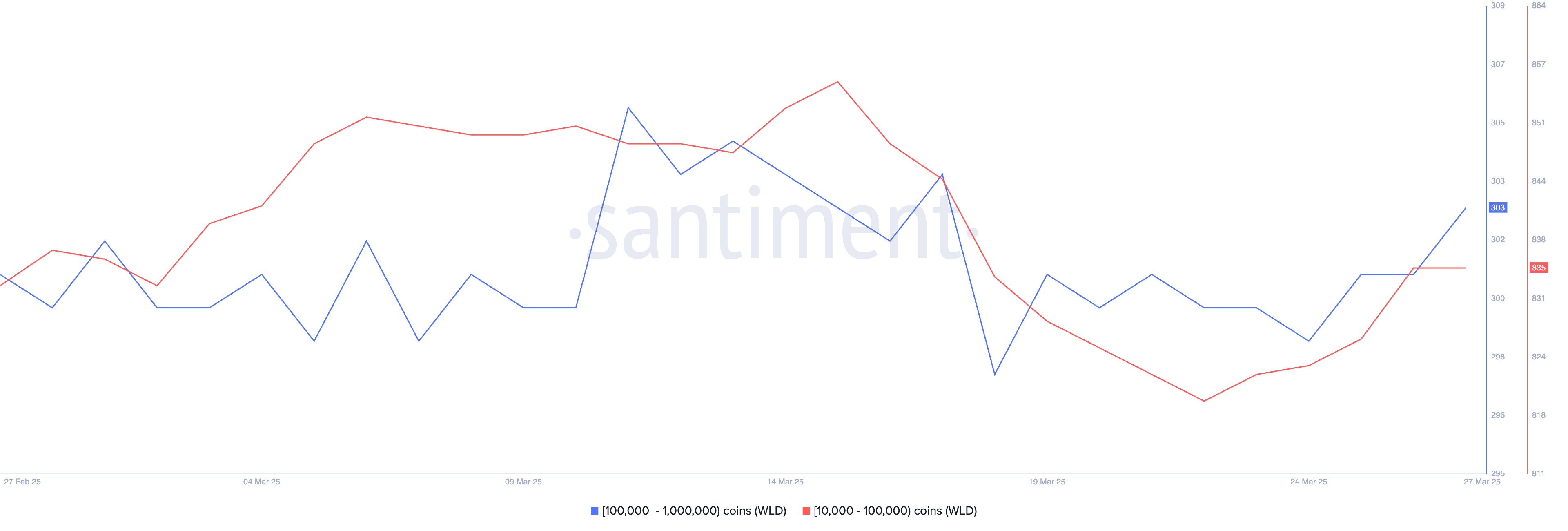 WLD cũng thu hút sự tích lũy, ngay cả sau khi giảm 19% trong 30 ngày qua, với các cá voi gia tăng vị thế của họ trong bốn ngày qua. Sự thay đổi trong hành vi trên chuỗi này cho thấy rằng một số người chơi lớn có thể đang chuẩn bị cho một sự phục hồi tiềm năng của các tài sản này.