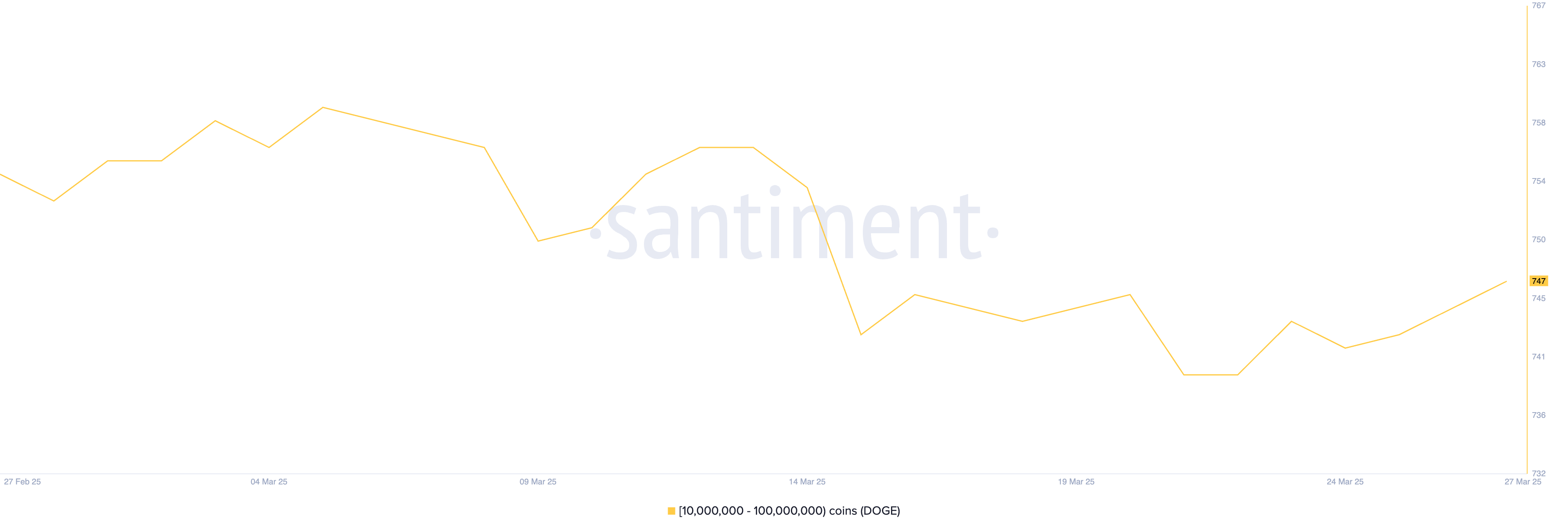 Cụ thể, số lượng ví nắm giữ từ 10 triệu đến 100 triệu DOGE đã tăng từ 740 lên 747—mức cao nhất trong hai tuần.