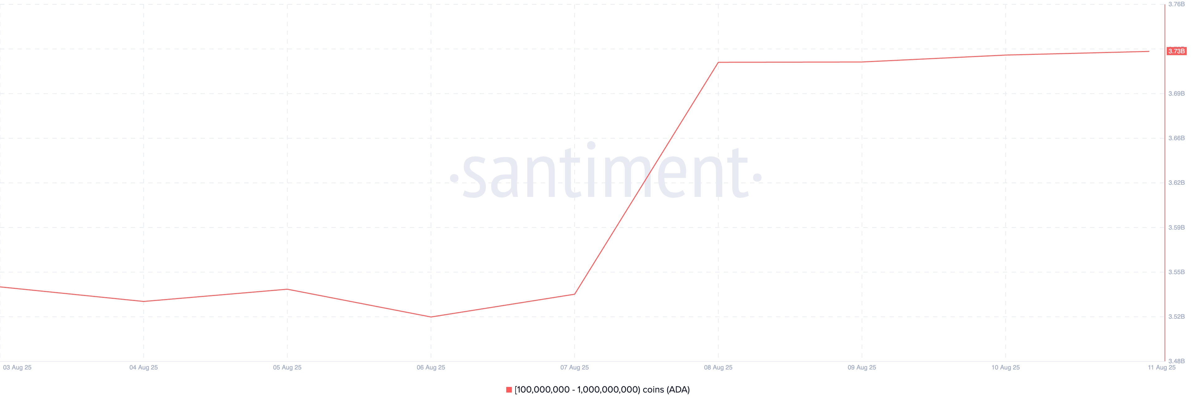 Coin lớp 1 (L1) ADA là một tài sản khác mà các nhà đầu tư lớn đang mua trước khi CPI của Mỹ được công bố vào ngày mai. Theo Santiment, các địa chỉ cá voi nắm giữ từ 100 triệu đến 1 tỷ coin đã tích lũy tổng cộng 190 triệu ADA trong bảy ngày qua.