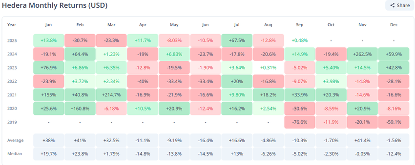 Tuy nhiên, dữ liệu lịch sử cho thấy HBAR thỉnh thoảng đã phục hồi sau thời gian yếu kém kéo dài, gợi ý rằng tháng 9 có thể mang lại một số sự nhẹ nhõm nếu điều kiện cải thiện.