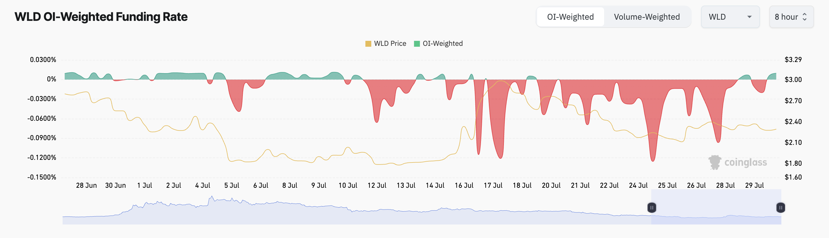 Theo Coinglass, tỷ lệ tài trợ (funding rate) của WLD đã duy trì trạng thái âm trong phần lớn thời gian kể từ ngày 11/07.
