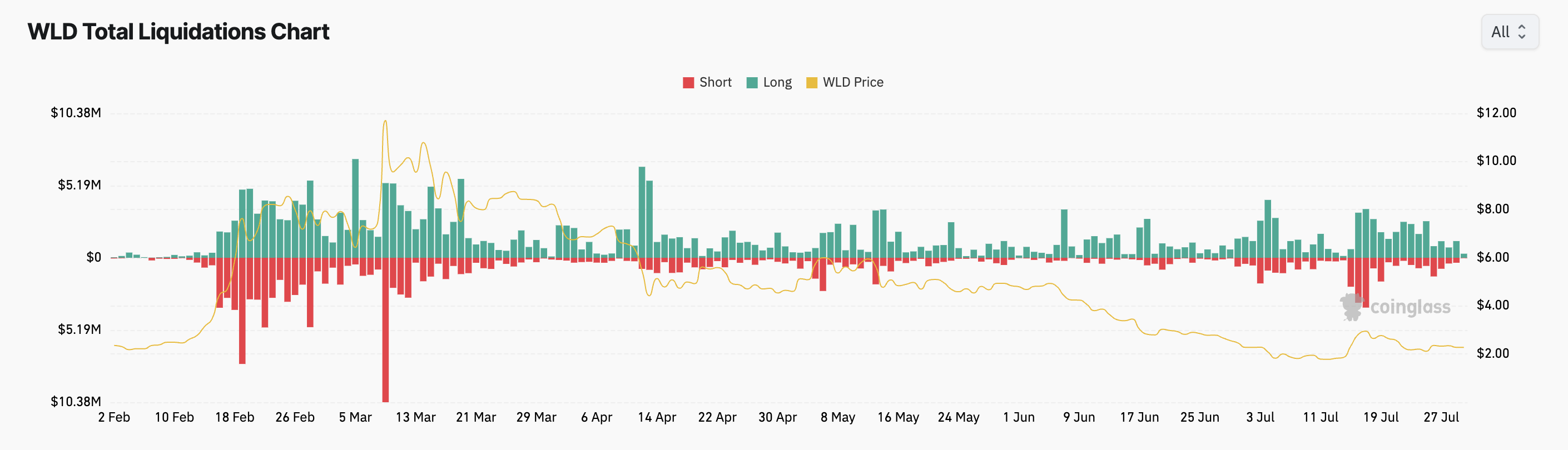 Theo dữ liệu từ Coinglass, trong bảy ngày qua, khối lượng thanh lý vị thế Long của WLD đã đạt khoảng 11,46 triệu USD.