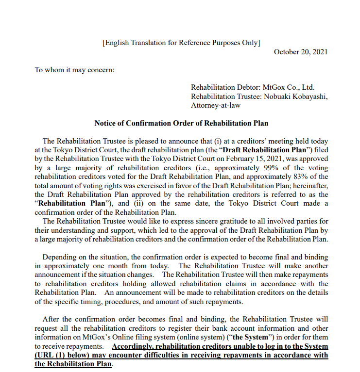 - Bản dự thảo về kế hoạch phục hồi và hoàn trả BTC được Mt. Gox đệ trình tòa án Tokyo từ tháng 2/2021.