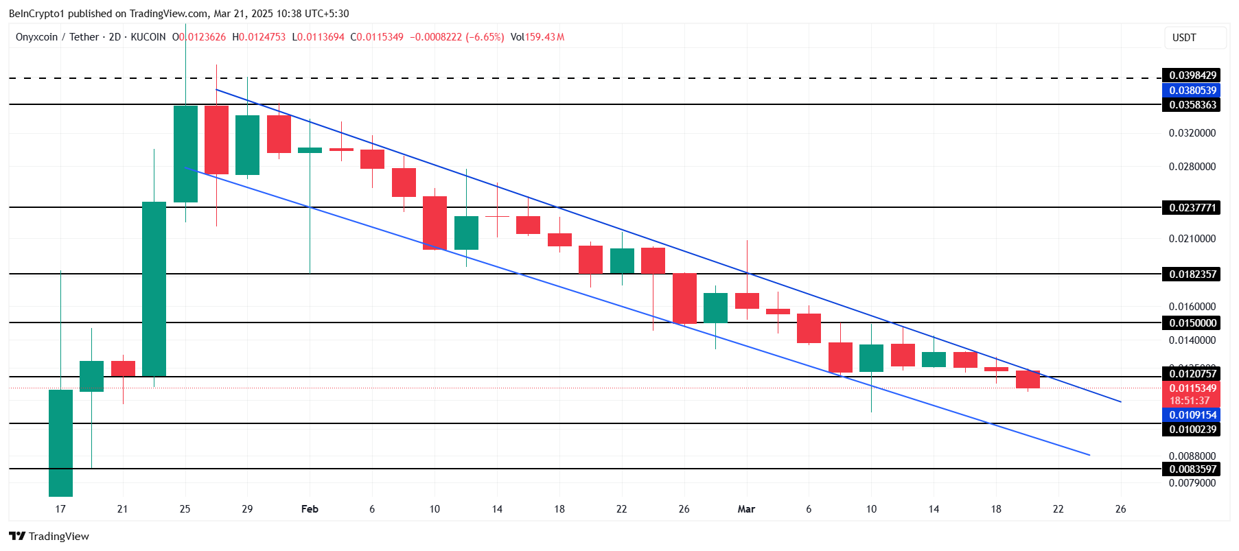 Giá của Onyxcoin hiện đang dao động quanh mức 0.0115 USD, không thể thoát khỏi mô hình kênh giảm. Altcoin này đã trượt xuống dưới mức hỗ trợ quan trọng 0.0120 USD, củng cố vị trí của nó trong xu hướng giảm. Với thị trường rộng lớn hơn không có dấu hiệu phục hồi ngay lập tức cho XCN, một sự giảm giá tiếp theo có vẻ có khả năng xảy ra.