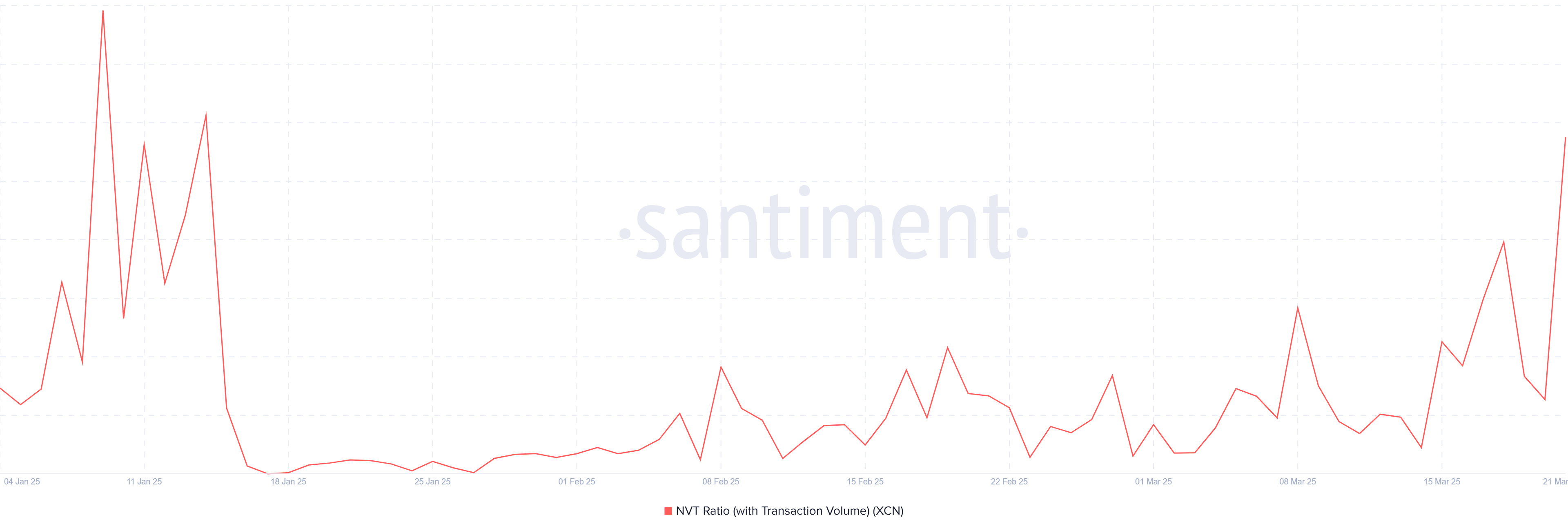 Tỷ lệ Network Value to Transactions (NVT) của Onyxcoin gần đây đã đạt mức cao nhất trong hai tháng, báo hiệu khả năng bị định giá quá cao. Tỷ lệ NVT so sánh hoạt động mạng với hoạt động giao dịch, và sự gia tăng này cho thấy sự cường điệu xung quanh XCN không được hỗ trợ bởi giao dịch thực tế. Khi hoạt động mạng vượt xa khối lượng giao dịch, thường dẫn đến các đợt điều chỉnh hoặc giai đoạn hợp nhất.