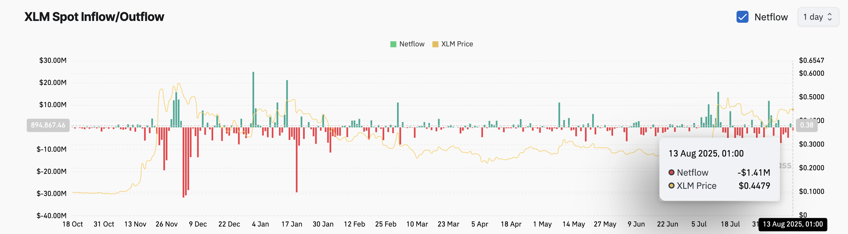 Hơn nữa, sự suy giảm dòng vốn vào thị trường giao ngay XLM xác nhận nhu cầu giảm đối với altcoin này. Theo Coinglass, altcoin này đã ghi nhận dòng ra ròng 1.41 triệu USD hôm nay, nhấn mạnh sự thiếu hỗ trợ đằng sau mức tăng 4% của XLM.