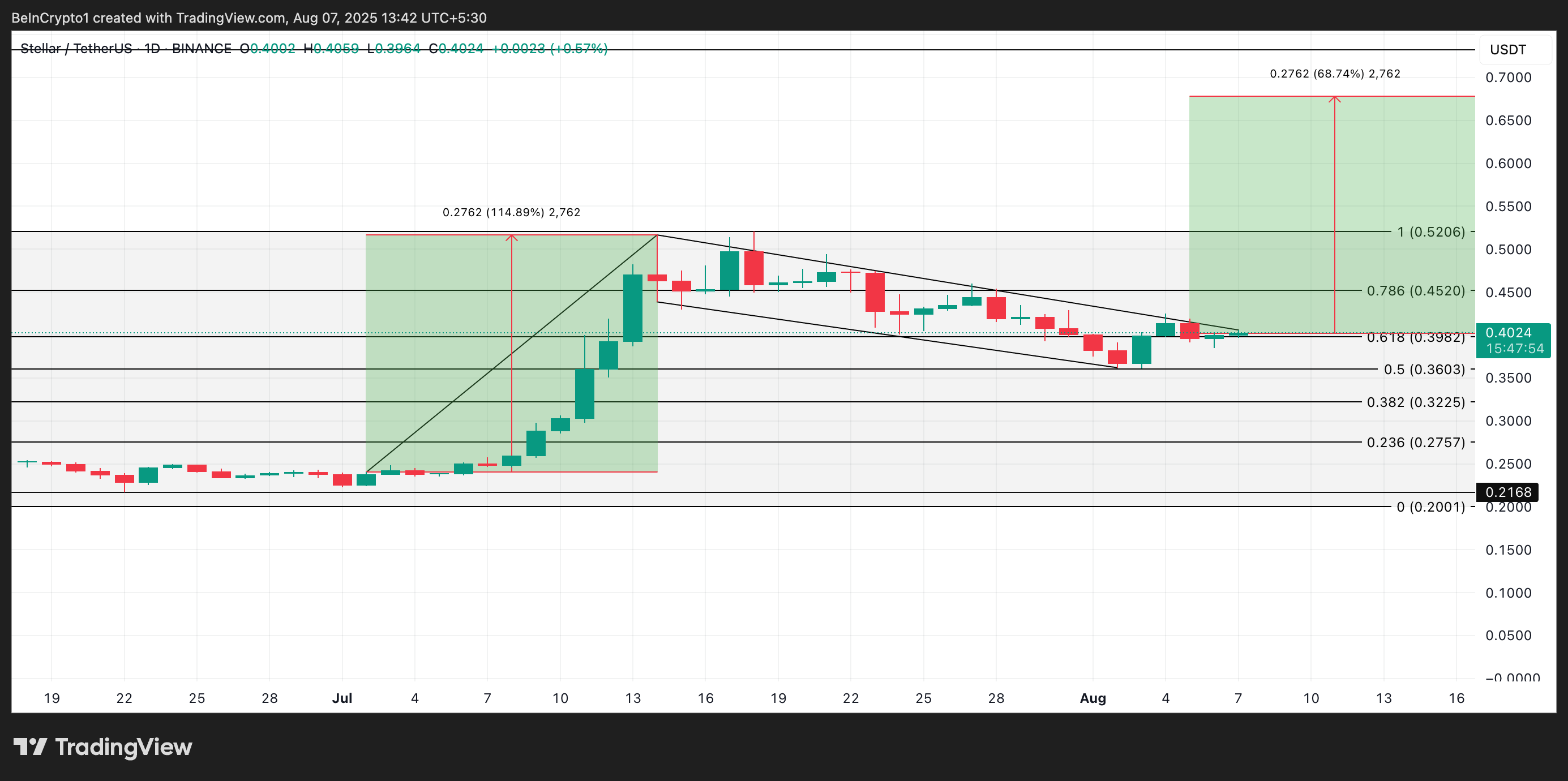 Altcoin này đã hình thành mô hình cờ tăng cổ điển trên biểu đồ hàng ngày, một xu hướng thường báo trước một đợt tăng giá kéo dài. Nếu mô hình này giữ vững, XLM có thể tiến tới mức 0.67 USD.