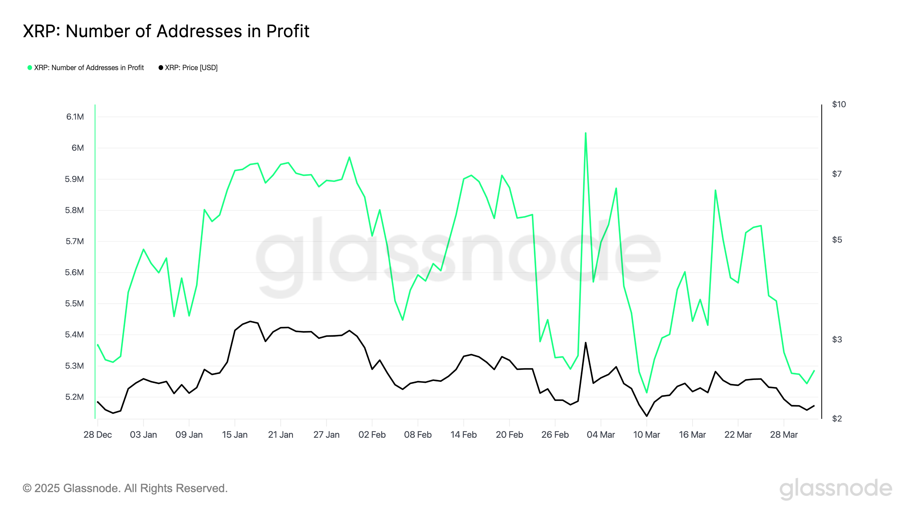 Giữa lúc giá XRP giảm, tổng số địa chỉ ví giữ token có lợi nhuận đã giảm xuống mức thấp nhất trong năm là 5.24 triệu vào ngày 31/03/2025. Sự sụt giảm này phản ánh áp lực tiêu cực kéo dài lên altcoin khi nhiều người nắm giữ thấy mình đang ở vị thế thua lỗ do giá token giảm kéo dài.