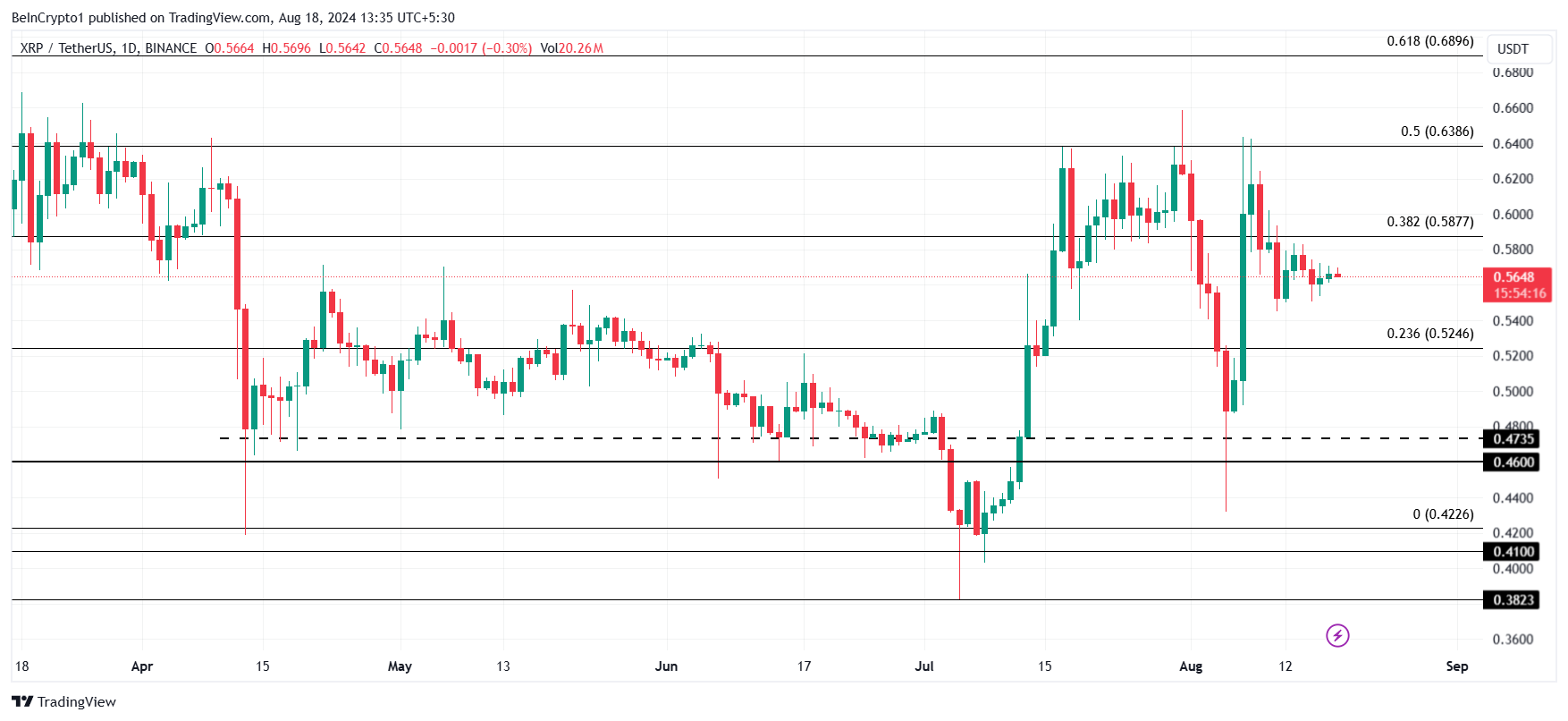 Giá XRP đã có xu hướng giảm trong suốt tháng 8, khó có thể phục hồi sau khi giảm xuống dưới 0.60 USD. Tâm lý nhà đầu tư dường như đang củng cố xu hướng giảm trên toàn thị trường, có thể dẫn đến sự sụt giảm tiếp theo của giá XRP.