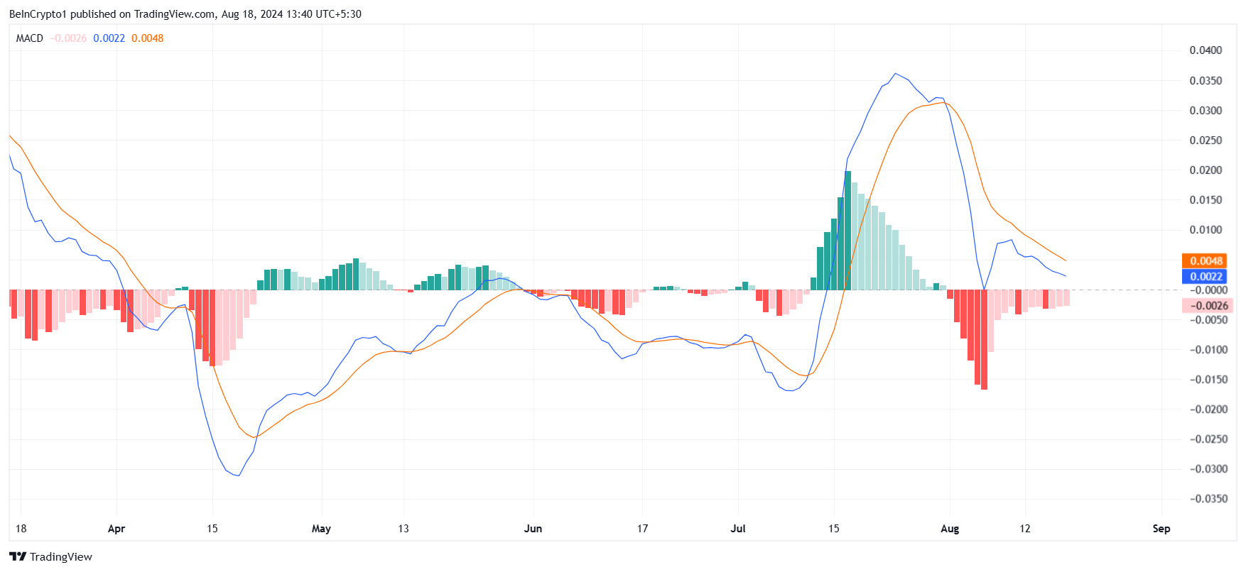 Chỉ báo Moving Average Convergence Divergence (MACD) cũng phản ánh sự giảm sút niềm tin này. MACD, được sử dụng để đánh giá động lực, cho thấy động lực tăng của XRP đang suy yếu. MACD đang cho tín hiệu các đường hội tụ, chỉ báo này ám chỉ sự tiếp tục của xu hướng giảm hiện tại.