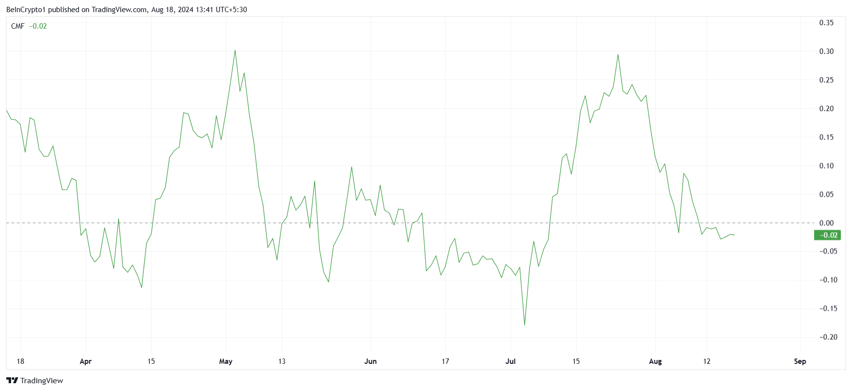 Một vài dấu hiệu cho thấy giá của XRP đang bị ảnh hưởng bởi sự thay đổi trong tâm lý nhà đầu tư, đặc biệt với dòng vốn rút ra ngày càng tăng. Chỉ báo Chaikin Money Flow (CMF) theo dõi tiền chảy vào và ra khỏi tài sản, cho thấy xu hướng rõ ràng của việc rút tiền, phản ánh sự giảm sút niềm tin vào XRP.