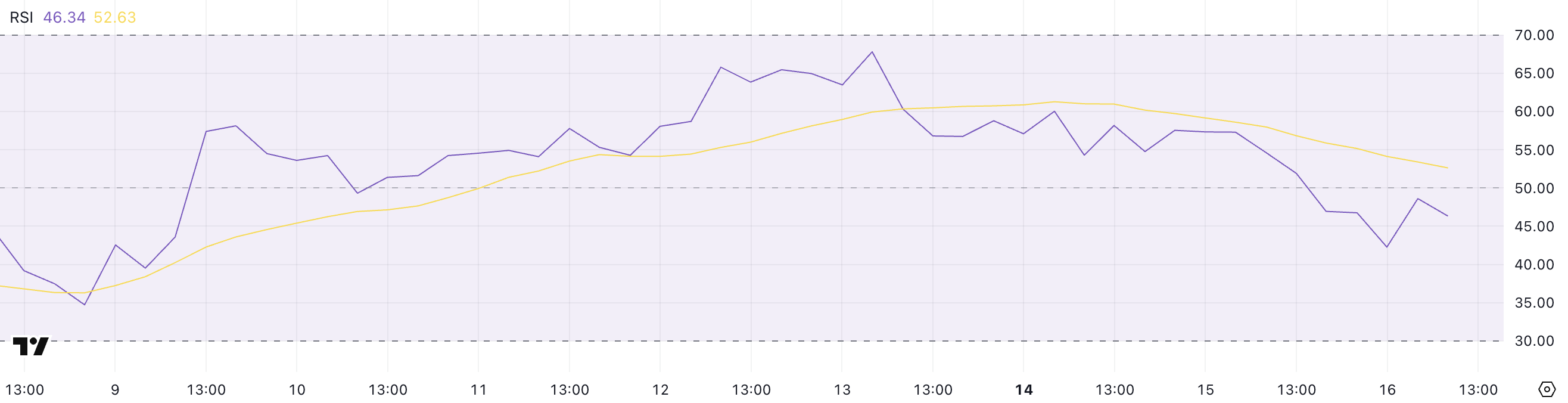 Khi RSI trên 50, động lực thường là tăng, trong khi các mức dưới 50 phản ánh sự gia tăng của xu hướng giảm. Với XRP hiện tại ở mức 46.34, điều này cho thấy tài sản đang mất động lực tăng và có thể đối mặt với rủi ro giảm thêm trừ khi sự quan tâm mua trở lại sớm.