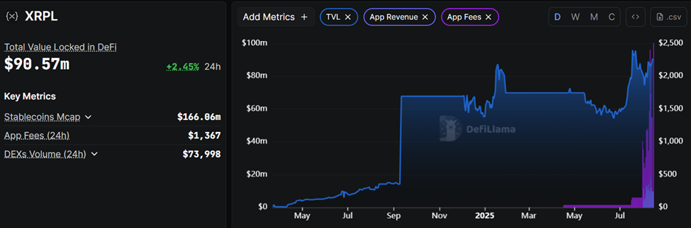 Ở nơi khác, dữ liệu trên DefiLlama cho thấy tổng giá trị bị khóa (TVL) của XRPL chỉ ở mức 90.57 triệu USD. Trong khi đó, doanh thu từ ứng dụng nằm trong khoảng 200 đến 300 USD, với phí ứng dụng tổng cộng là 1,367 USD.