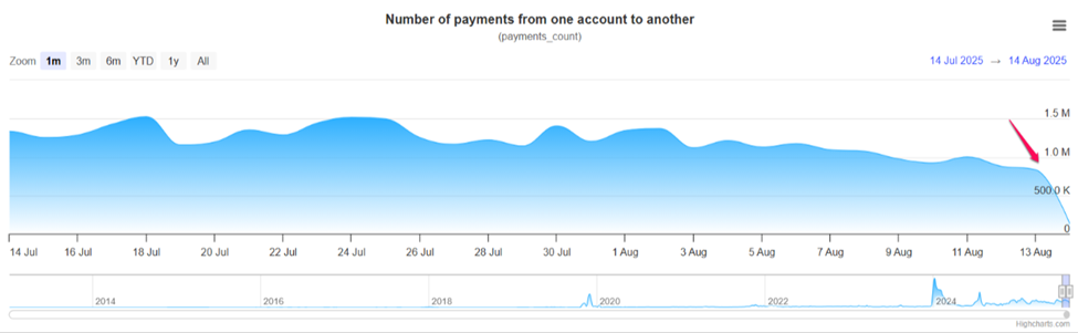 Các khoản thanh toán được xử lý trên mạng đã giảm gần 50%, từ 1.5 triệu xuống còn 835,000. Điều này làm suy yếu kỳ vọng rằng việc sử dụng trên chuỗi sẽ tăng cùng với sự tăng giá gần đây của XRP.
