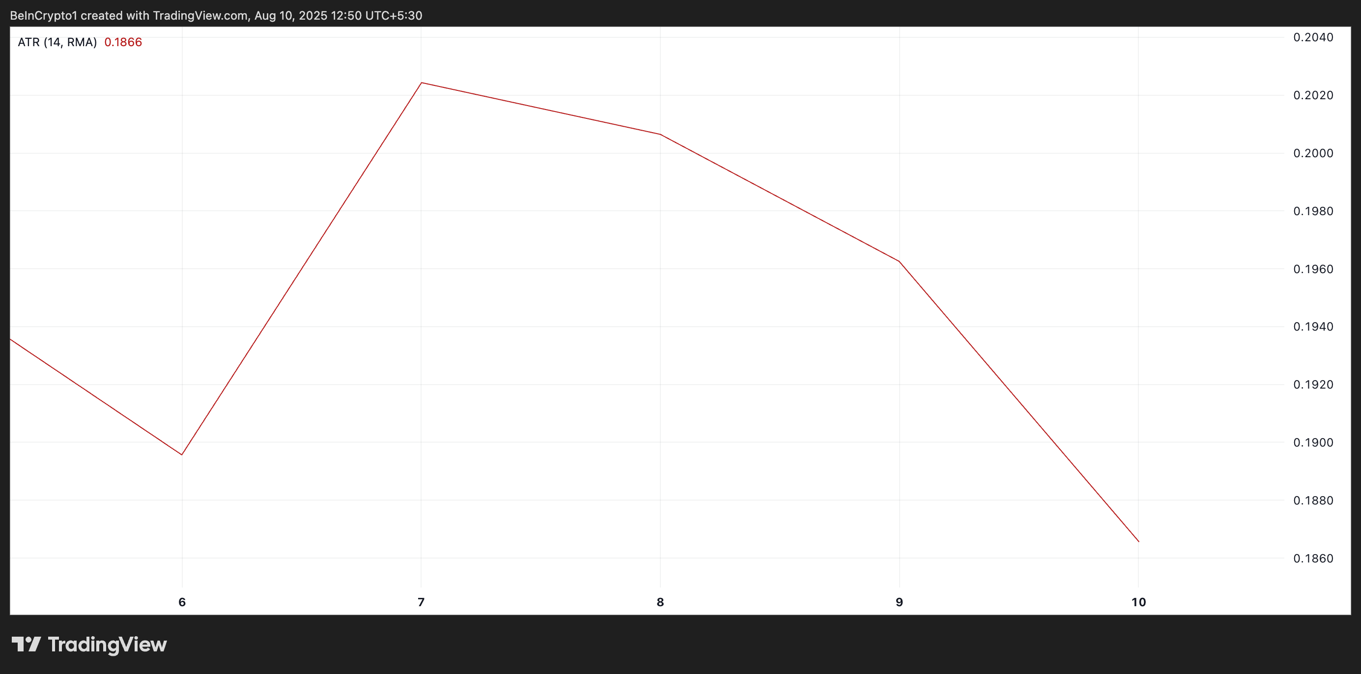 Sự giảm biến động rõ ràng trong Chỉ số Biến động Thực tế Trung bình (ATR) của XRP, đã giảm 10% kể từ 07/08. ATR đo lường mức độ dao động giá trong một khoảng thời gian nhất định, và ATR giảm cho thấy điều kiện thị trường yên tĩnh hơn với ít biến động hơn.
