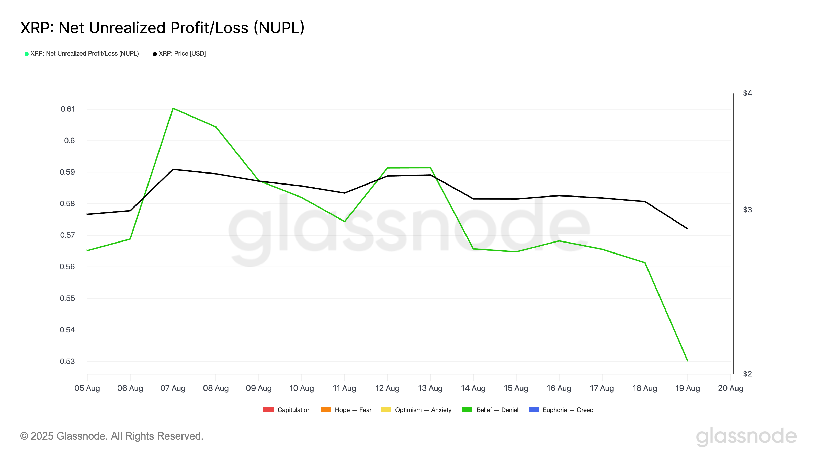 Theo Glassnode, các chỉ số từ chỉ số Net Unrealized Profit/Loss (NUPL) của XRP cho thấy thị trường hiện đang ở trong vùng niềm tin–phủ nhận, nơi các nhà đầu tư giữ lại lợi nhuận mặc dù thua lỗ gia tăng.