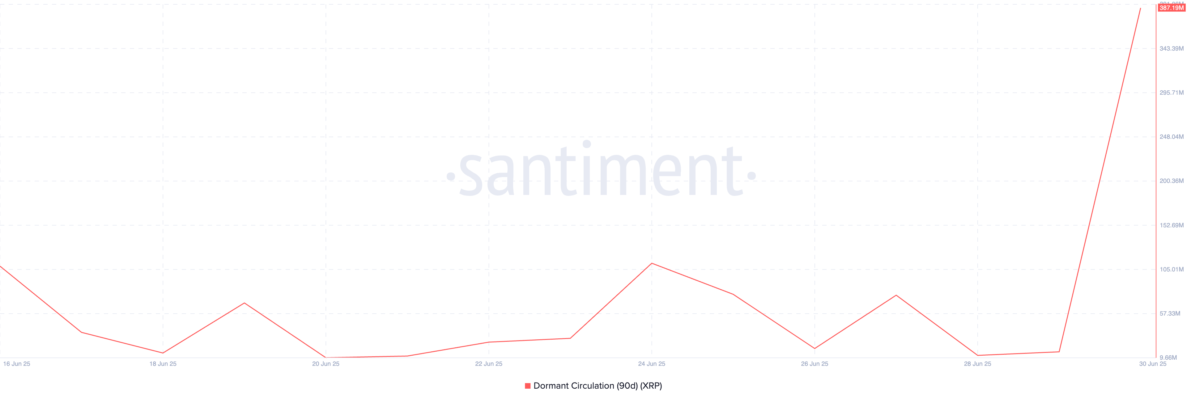 Theo nhà cung cấp dữ liệu trên chuỗi Santiment, chỉ số Dormant Circulation (90 ngày) của XRP đã tăng vọt lên 387.19 triệu vào thứ Hai, mức cao nhất trong ba tuần.