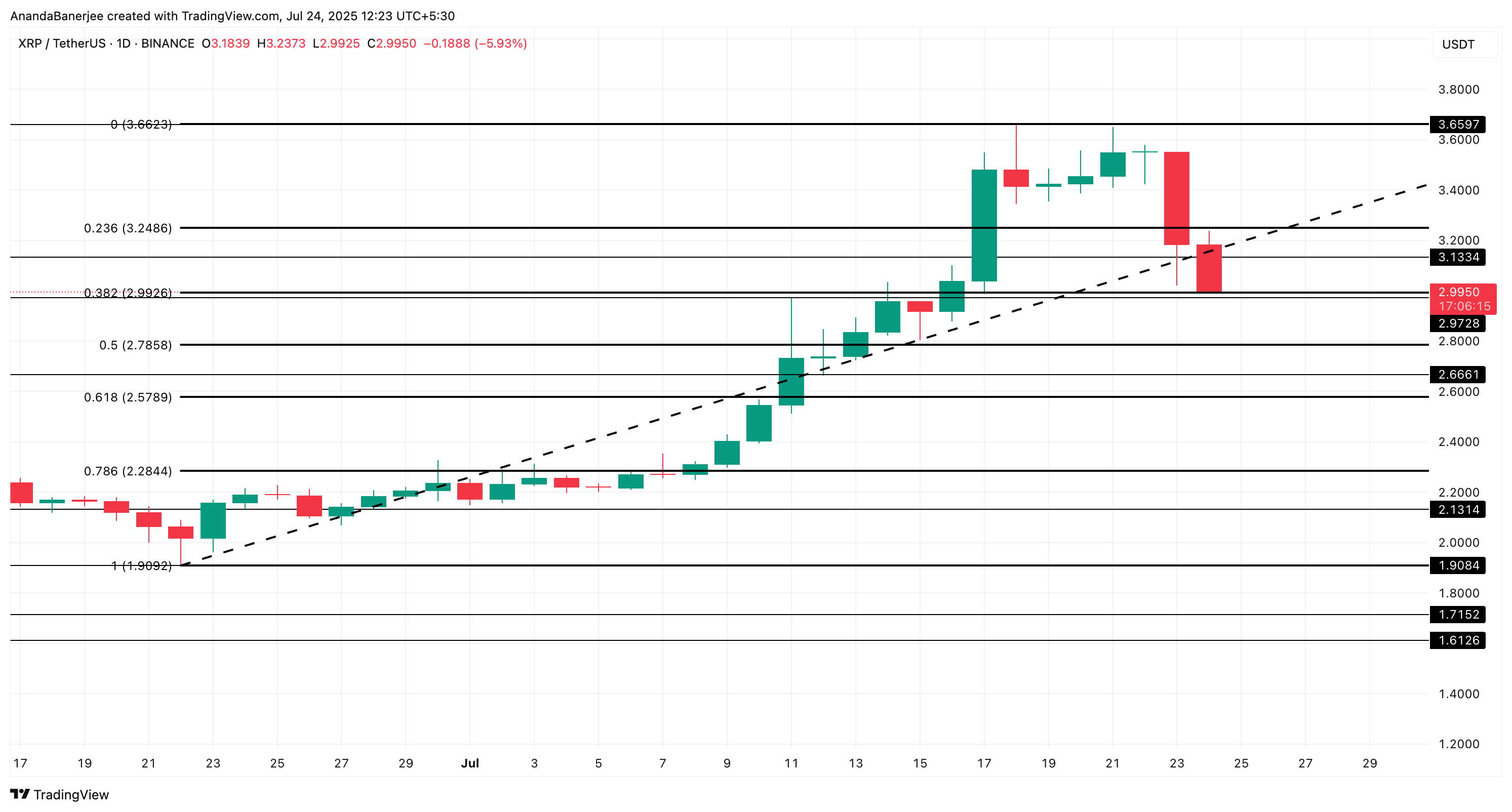 Giá XRP hiện đang giao dịch dưới mức 3.00 USD, sau khi giảm gần 13% trong một ngày. Sự sụt giảm đó đã cắt qua mức hỗ trợ quan trọng 3.13 USD, và hiện tại giá đang dao động quanh mức 2.99 USD; một mức phù hợp với mức thoái lui Fibonacci 0.382.