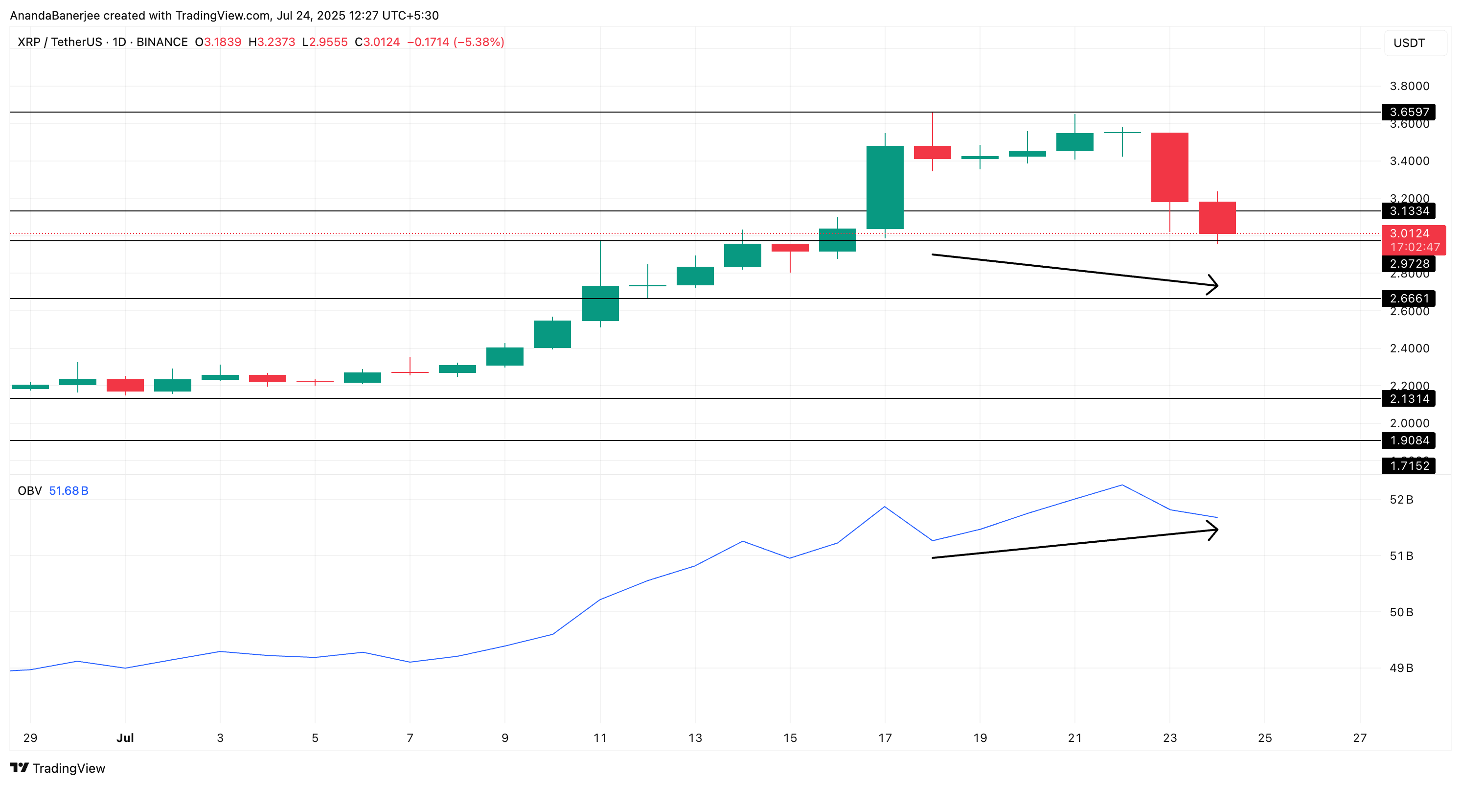 Đó là một sự phân kỳ tăng giá. Điều này có nghĩa là mọi người vẫn đang mua XRP trên các sàn giao dịch giao ngay, ngay cả khi giá đang giảm. OBV tăng lên có nghĩa là khối lượng giao dịch trên các nến xanh nhiều hơn các nến đỏ. Vì vậy, mặc dù XRP đang ở mức 2.99 USD, hành động khối lượng cơ bản không xác nhận xu hướng giảm giá.