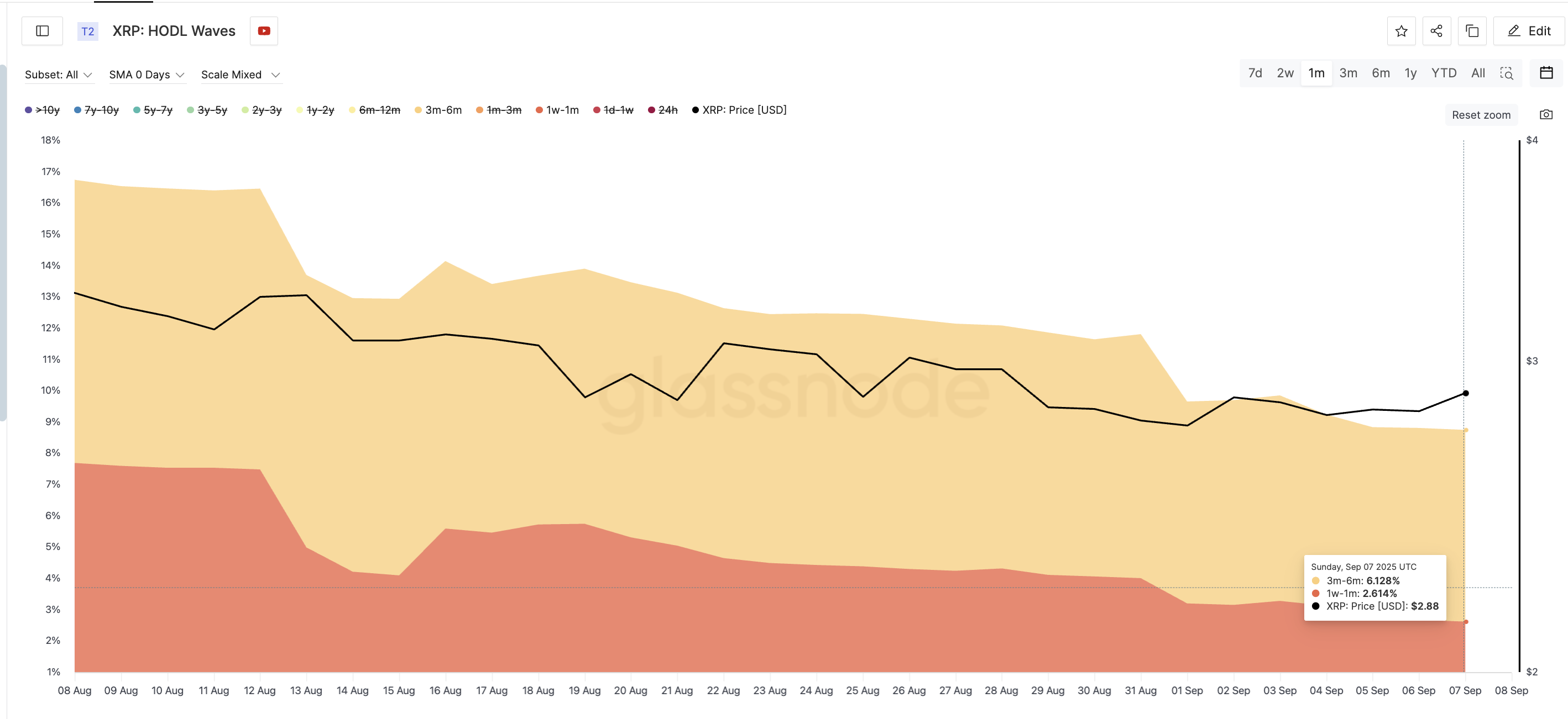 Động thái tăng giá rõ ràng nhất đến từ các “cá voi”. Vào ngày 03/09/2025, khi XRP giao dịch trên 2.85 USD, hai nhóm lớn các nhà đầu tư đã bắt đầu thêm coin. Nhóm đầu tiên nắm giữ ít nhất 1 tỷ XRP, và nhóm thứ hai nắm giữ từ 10 triệu đến 100 triệu.
