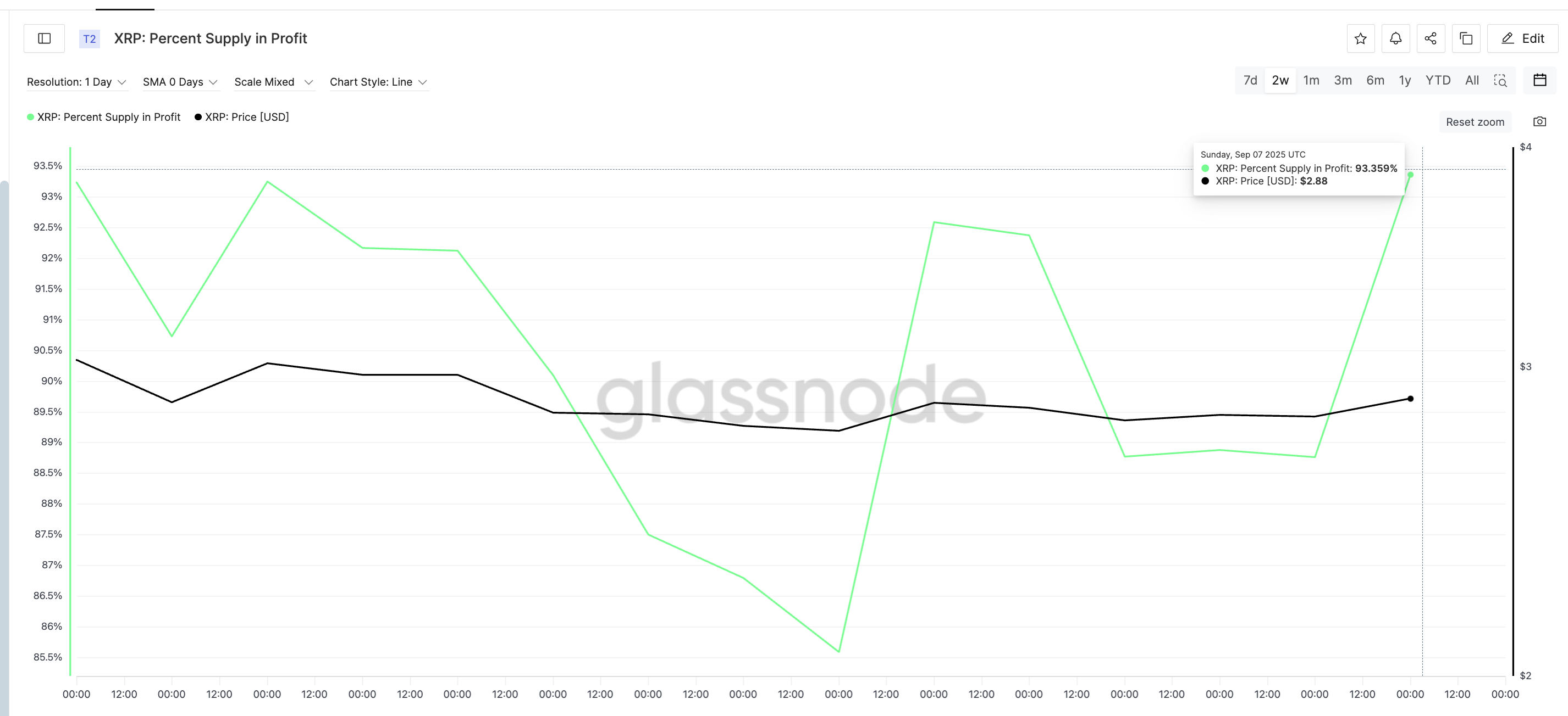 • Phần trăm nguồn cung có lãi: Vào ngày 01/09/2025, khoảng 85.6% tất cả các nhà đầu tư XRP có lãi. Đến ngày 07/09/2025, con số đó tăng lên khoảng 93.4%. Khi hầu hết các nhà đầu tư có lãi, nhiều người cảm thấy bị cám dỗ để bán ra.