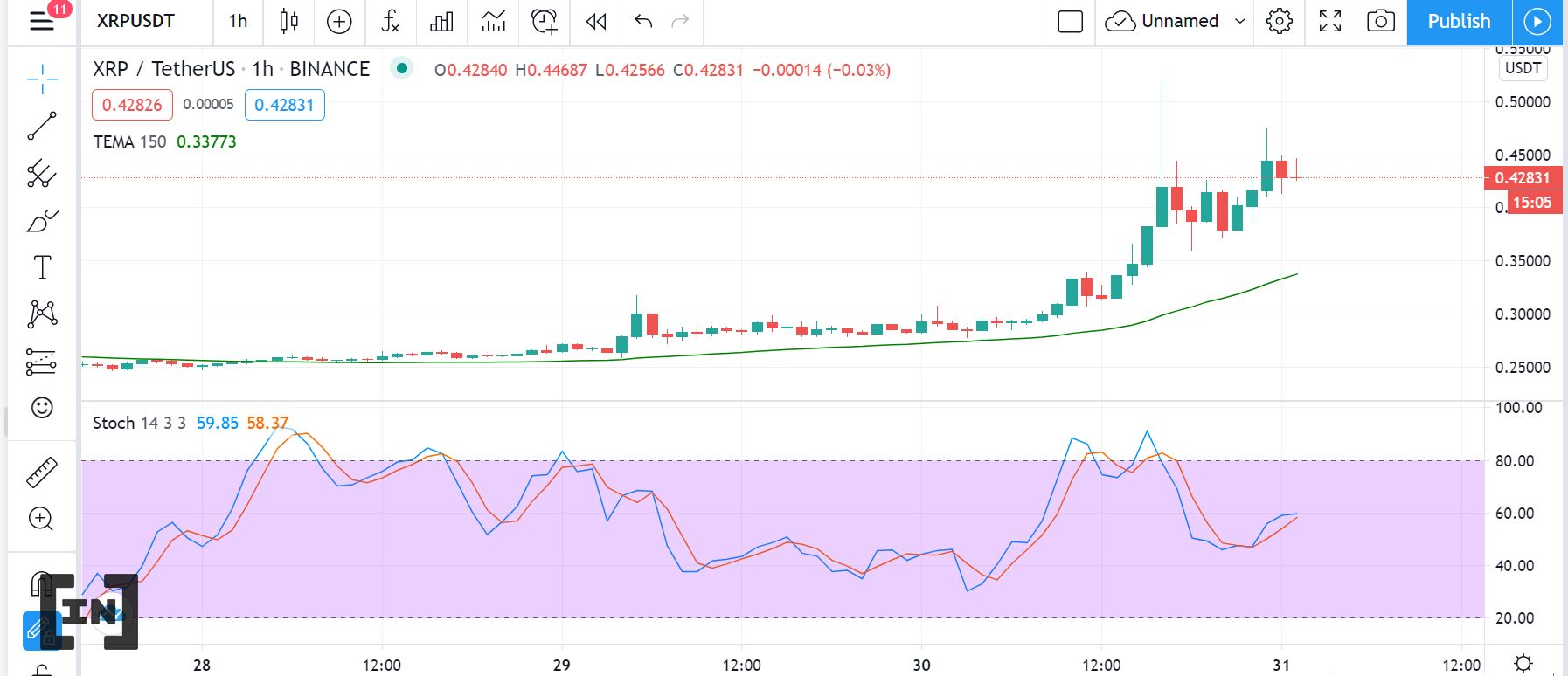 Hiện tại, XRP đã quay lại mức ổn định hơn tại điểm giá 0,42 USD. Qua sự hậu thuẫn từ nhóm WallStreetBets, chúng ta thấy một mô hình parabol tăng dần trên biểu đồ.