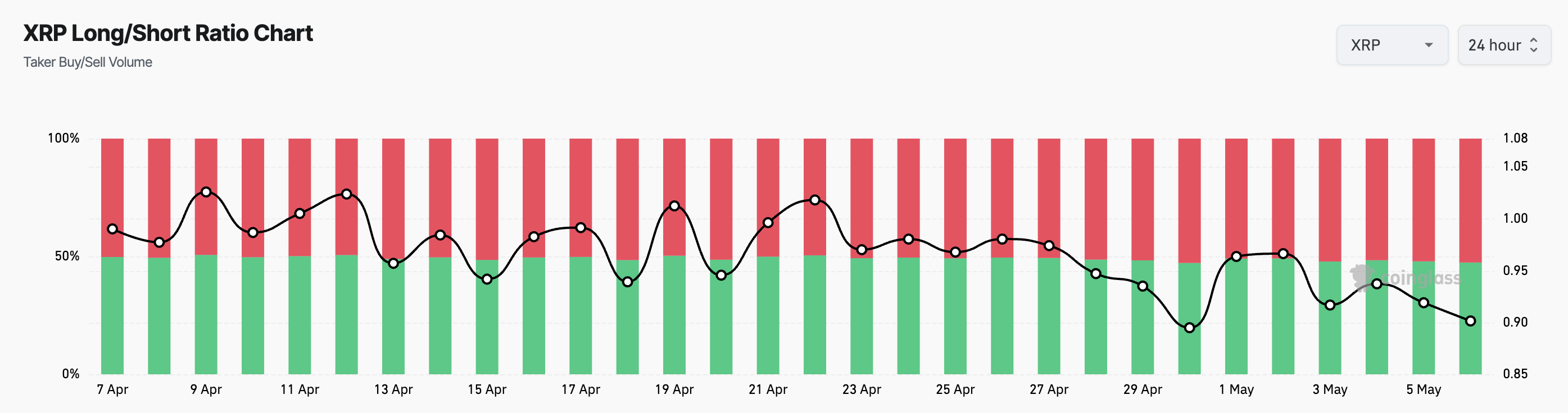 Theo Coinglass, XRP lần cuối ghi nhận tỷ lệ long/short trên 1 vào ngày 22/04. Điều này có nghĩa là đã hơn hai tuần kể từ khi các vị thế tăng giá vượt trội hơn các vị thế giảm giá trong thị trường tương lai của XRP. Thời gian dài của sự thống trị giảm giá cho thấy rằng các thành viên thị trường ngày càng bi quan về triển vọng ngắn hạn của XRP.