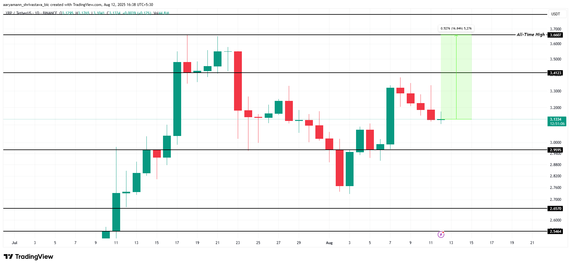 XRP hiện đang giao dịch ở mức 3.13 USD, đã trải qua một sự giảm nhẹ trong bốn ngày qua. Altcoin này vẫn thấp hơn 16.8% so với ATH của nó là 3.66 USD, mà các nhà đầu tư đang nhắm đến. Tâm lý lạc quan đang diễn ra, cùng với sự tích lũy của các cá voi, giữ giá trong phạm vi của một đợt bứt phá tiềm năng.